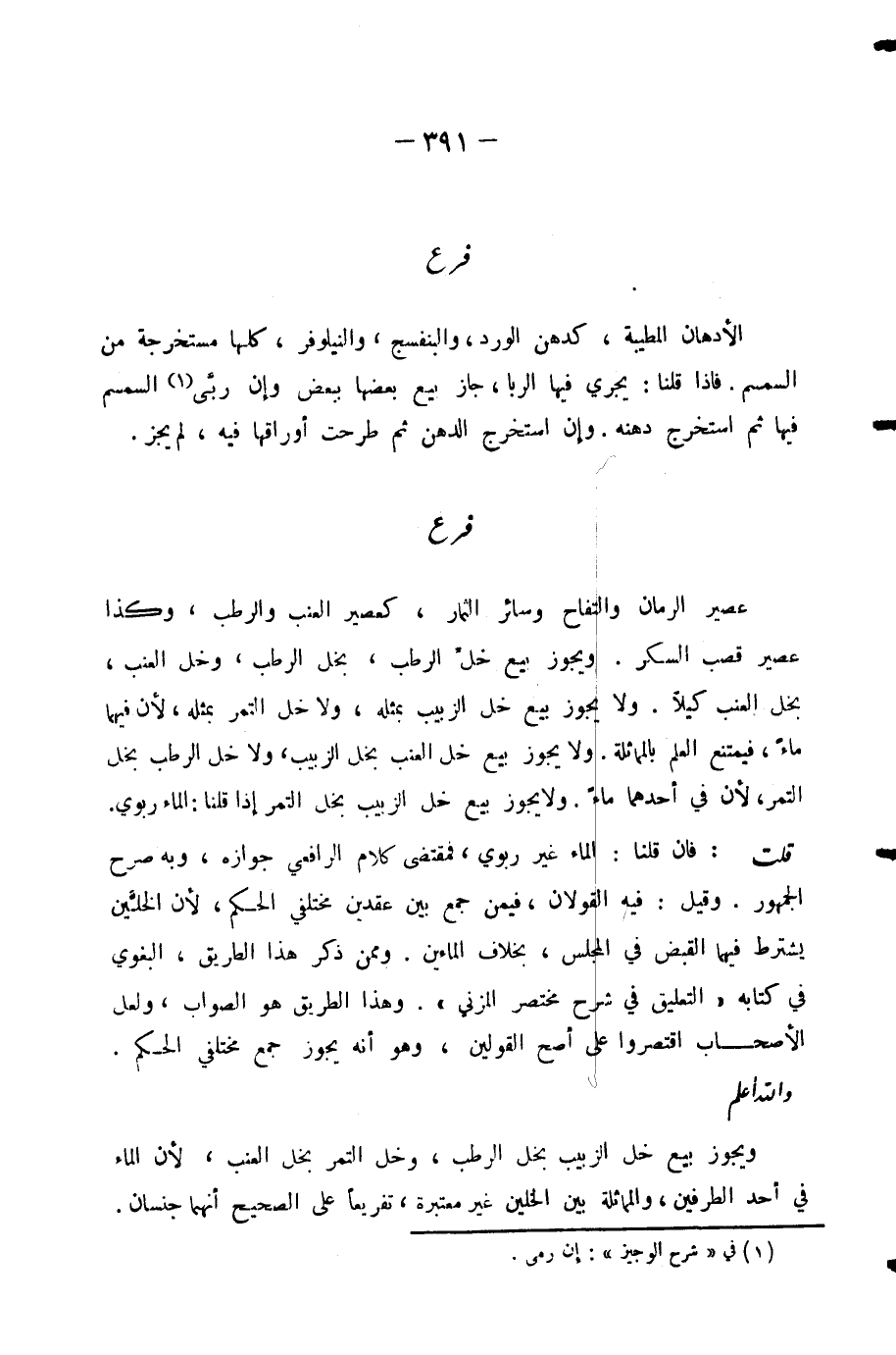 الْأَدْهَانُ الْمُطَيِّبَةُ، كَدُهْنِ الْوَرْدِ، وَالْبَنَفْسَجِ، وَالنَّيْلُوفَرِ، كُلُّهَا مُسْتَخْرَجَةٌ مِنَ السِّمْسِمِ. فَإِذَا قُلْنَا: يَجْرِي فِيهَا الرِّبَا، جَازَ بَيْعُ بَعْضِهَا بِبَعْضٍ وَإِنْ رَبَّى السِّمْسِمَ فِيهَا ثُمَّ اسْتَخْرَجَ دُهْنَهُ. وَإِنِ اسْتَخْرَجَ الدُّهْنَ ثُمَّ طُرِحَتْ أَوْرَاقُهَا فِيهِ، لَمْ يَجُزْ.