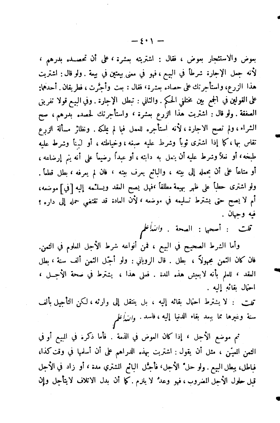 وَأَمَّا الشَّرْطُ الصَّحِيحُ فِي الْبَيْعِ، فَمِنْ أَنْوَاعِهِ شَرْطُ الْأَجَلِ الْمَعْلُومِ فِي الثَّمَنِ. فَإِنْ كَانَ الثَّمَنُ مَجْهُولًا، بَطَلَ. قَالَ الرُّويَانِيُّ: وَلَوْ أَجَّلَ الثَّمَنَ أَلْفَ سَنَةٍ، بَطَلَ الْعَقْدُ، لِلْعِلْمِ بِأَنَّهُ لَا يَعِيشُ هَذِهِ الْمُدَّةَ. فَعَلَى هَذَا، يُشْتَرَطُ فِي صِحَّةِ الْأَجَلِ، احْتِمَالُ بَقَائِهِ إِلَيْهِ.