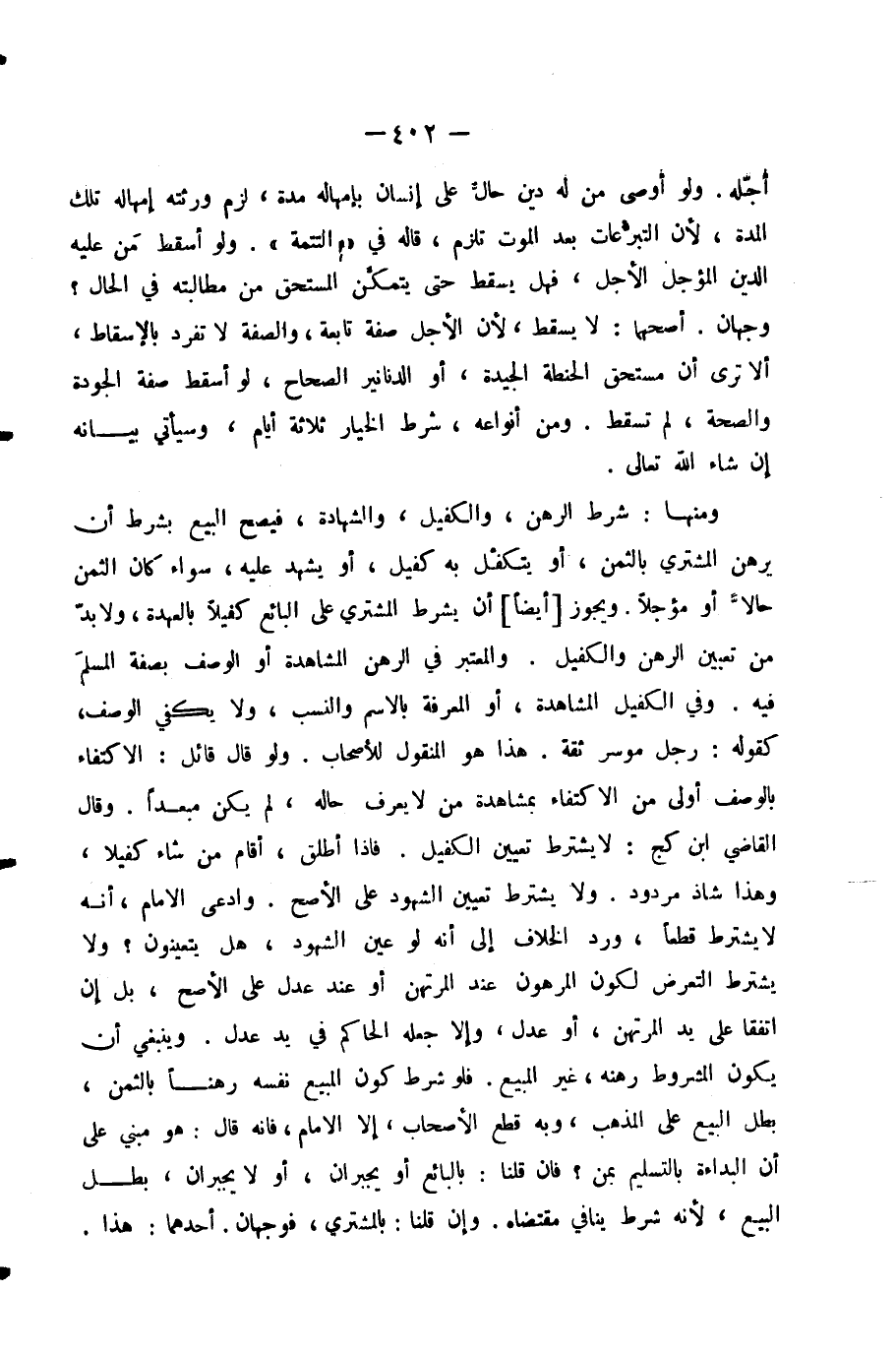 وَمِنْهَا: شَرْطُ الرَّهْنِ، وَالْكَفِيلِ، وَالشَّهَادَةِ، فَيَصِحُّ الْبَيْعُ بِشَرْطِ أَنْ يَرْهَنَ الْمُشْتَرِي بِالثَّمَنِ، أَوْ يَتَكَفَّلَ بِهِ كَفِيلٌ، أَوْ يَشْهَدَ عَلَيْهِ، سَوَاءٌ كَانَ الثَّمَنُ حَالًّا أَوْ مُؤَجَّلًا. وَيَجُوزُ أَيْضًا أَنْ يَشْرُطَ الْمُشْتَرِي عَلَى الْبَائِعِ كَفِيلًا بِالْعُهْدَةِ، وَلَا بُدَّ مِنْ تَعْيِينِ الرَّهْنِ وَالْكَفِيلِ. وَالْمُعْتَبَرُ فِي الرَّهْنِ الْمُشَاهَدَةُ أَوِ الْوَصْفُ بِصِفَةِ الْمُسَلَّمِ فِيهِ. وَفِي الْكَفِيلِ الْمُشَاهَدَةُ، أَوِ الْمَعْرِفَةُ بِالِاسْمِ وَالنَّسَبِ، وَلَا يَكْفِي الْوَصْفُ، كَقَوْلِهِ: رَجُلٌ مُوسِرٌ ثِقَةٌ. هَذَا هُوَ الْمَنْقُولُ لِلْأَصْحَابِ. وَلَوْ قَالَ قَائِلٌ: الِاكْتِفَاءُ بِالْوَصْفِ أَوْلَى مِنَ الِاكْتِفَاءِ بِمُشَاهَدَةِ مَنْ لَا يُعْرَفُ حَالُهُ، لَمْ يَكُنْ مُبْعِدًا. وَقَالَ الْقَاضِي ابْنُ كَجٍّ: لَا يُشْتَرَطُ تَعْيِينُ الْكَفِيلِ. فَإِذَا أَطْلَقَ، أَقَامَ مَنْ شَاءَ كَفِيلًا، وَهَذَا شَاذٌّ مَرْدُودٌ. وَلَا يُشْتَرَطُ تَعْيِينُ الشُّهُودِ عَلَى الْأَصَحِّ. وَادَّعَى الْإِمَامُ، أَنَّهُ لَا يُشْتَرَطُ قَطْعًا، وَرَدَّ الْخِلَافَ إِلَى أَنَّهُ لَوْ عَيَّنَ الشُّهُودَ، هَلْ يَتَعَيَّنُونَ؟ وَلَا يُشْتَرَطُ التَّعَرُّضُ لِكَوْنِ الْمَرْهُونِ عِنْدَ الْمُرْتَهِنِ أَوْ عِنْدَ عَدْلٍ عَلَى الْأَصَحِّ، بَلْ إِنِ اتَّفَقَا عَلَى يَدِ الْمُرْتَهِنِ، أَوْ عَدْلٍ، وَإِلَّا جَعَلَهُ الْحَاكِمُ فِي يَدِ عَدْلٍ. وَيَنْبَغِي أَنْ يَكُونَ الْمَشْرُوطُ رَهْنُهُ غَيْرَ الْمَبِيعِ. فَلَوْ شَرَطَ كَوْنَ الْمَبِيعِ نَفْسِهِ رَهْنًا بِالثَّمَنِ، بَطَلَ الْبَيْعُ عَلَى الْمَذْهَبِ، وَبِهِ قَطَعَ الْأَصْحَابُ، إِلَّا الْإِمَامَ، فَإِنَّهُ قَالَ: هُوَ مَبْنِيٌّ عَلَى أَنَّ الْبَدَاءَةَ بِالتَّسْلِيمِ بِمَنْ؟ فَإِنْ قُلْنَا: بِالْبَائِعِ أَوْ يُجْبِرَانِ، أَوْ لَا يُجْبِرَانِ، بَطَلَ الْبَيْعُ؛ لِأَنَّهُ شَرْطٌ يُنَافِي مُقْتَضَاهُ. وَإِنْ قُلْنَا: بِالْمُشْتَرِي، فَوَجْهَانِ. أَحَدُهُمَا: هَذَا.