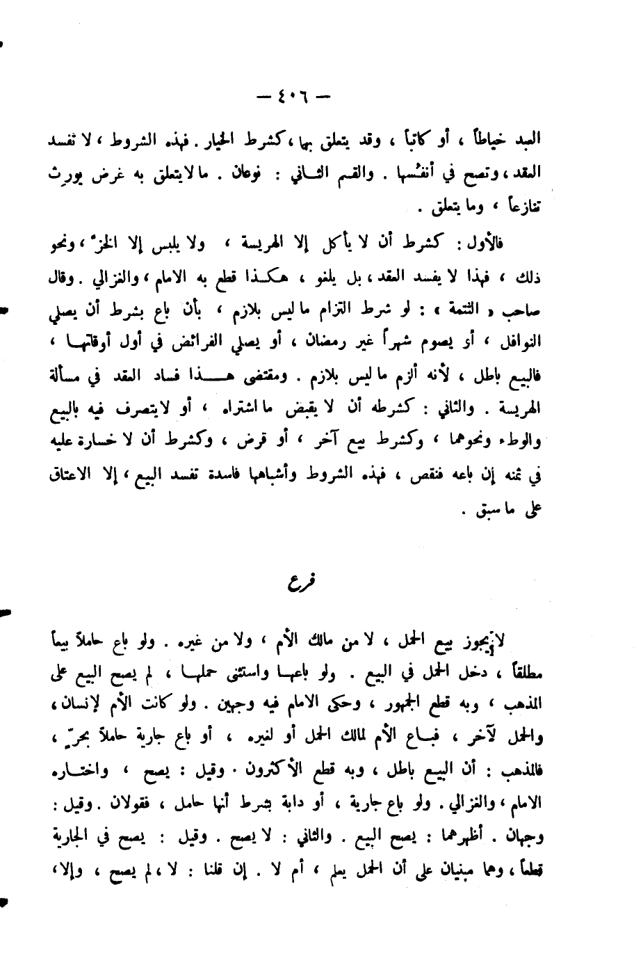 الْعَبْدُ خَيَّاطًا، أَوْ كَاتِبًا، وَقَدْ يَتَعَلَّقُ بِهِمَا، كَشَرْطِ الْخِيَارِ. فَهَذِهِ الشُّرُوطُ لَا تُفْسِدُ الْعَقْدَ، وَتَصِحُّ فِي أَنْفُسِهَا. وَالْقِسْمُ الثَّانِي: نَوْعَانِ. مَا لَا يَتَعَلَّقُ بِهِ غَرَضٌ يُورِثُ تَنَازُعًا، وَمَا يَتَعَلَّقُ.