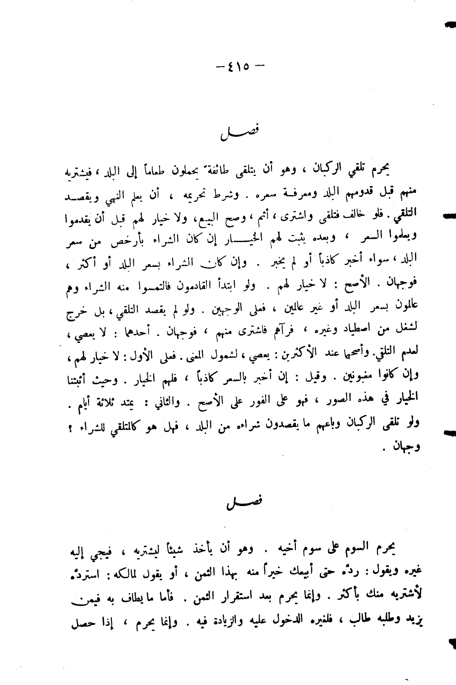يَحْرُمُ تَلَقِّي الرُّكْبَانِ، وَهُوَ أَنْ يَتَلَقَّى طَائِفَةً يَحْمِلُونَ طَعَامًا إِلَى الْبَلَدِ، فَيَشْتَرِيَهِ مِنْهُمْ قَبْلَ قُدُومِهِمُ الْبَلَدَ وَمَعْرِفَةِ سِعْرِهِ. وَشَرْطُ تَحْرِيمِهِ، أَنْ يَعْلَمَ النَّهْيَ وَيَقْصِدَ التَّلَقِّي. فَلَوْ خَالَفَ فَتَلَقَّى وَاشْتَرَى، أَثِمَ، وَصَحَّ الْبَيْعُ، وَلَا خِيَارَ لَهُمْ قَبْلَ أَنْ يَقْدُمُوا وَيَعْلَمُوا السِّعْرَ، وَبَعْدَهُ يَثْبُتُ لَهُمُ الْخِيَارُ إِنْ كَانَ الشِّرَاءُ بِأَرْخَصَ مِنْ سِعْرِ الْبَلَدِ، سَوَاءٌ أَخَبْرَ كَاذِبًا أَوْ لَمْ يُخْبِرْ. وَإِنْ كَانَ الشِّرَاءُ بِسِعْرِ الْبَلَدِ أَوْ أَكْثَرَ، فَوَجْهَانِ. الْأَصَحُّ: لَا خِيَارَ لَهُمْ. وَلَوِ ابْتَدَأَ الْقَادِمُونَ فَالْتَمَسُوا مِنْهُ الشِّرَاءَ وَهُمْ عَالِمُونَ بِسِعْرِ الْبَلَدِ أَوْ غَيْرُ عَالِمِينَ، فَعَلَى الْوَجْهَيْنِ. وَلَوْ لَمْ يَقْصِدِ التَّلَقِّي، بَلْ خَرَجَ لِشُغُلٍ مِنِ اصْطِيَادٍ وَغَيْرِهِ، فَرَآهُمْ فَاشْتَرَى مِنْهُمْ، فَوَجْهَانِ. أَحَدُهُمَا: لَا يَعْصِي؛ لِعَدَمِ التَّلَقِّي، وَأَصَحُّهُمَا عِنْدَ الْأَكْثَرِينَ: يَعْصِي؛ لِشُمُولِ الْمَعْنَى. فَعَلَى الْأَوَّلِ: لَا خِيَارَ لَهُمْ، وَإِنْ كَانُوا مَغْبُونِينَ. وَقِيلَ: إِنْ أَخْبَرَ بِالسِّعْرِ كَاذِبًا، فَلَهُمُ الْخِيَارُ. وَحَيْثُ أَثْبَتْنَا الْخِيَارَ فِي هَذِهِ الصُّوَرِ، فَهُوَ عَلَى الْفَوْرِ عَلَى الْأَصَحِّ. وَالثَّانِي: يَمْتَدُّ ثَلَاثَةَ أَيَّامٍ. وَلَوْ تَلَقَّى الرُّكْبَانَ وَبَاعَهُمْ مَا يَقْصِدُونَ شِرَاءَهُ مِنَ الْبَلَدِ، فَهَلْ هُوَ كَالْمُتَلَقِّي لِلشِّرَاءِ؟ وَجْهَانِ.