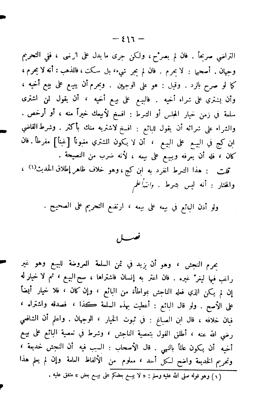 يَحْرُمُ النَّجْشُ، وَهُوَ أَنْ يَزِيدَ فِي ثَمَنِ السِّلْعَةِ الْمَعْرُوضَةِ لِلْبَيْعِ وَهُوَ غَيْرُ رَاغِبٍ فِيهَا لِيَغُرَّ غَيْرَهَ. فَإِنِ اغْتَرَّ بِهِ إِنْسَانٌ فَاشْتَرَاهَا، صَحَّ الْبَيْعُ، ثُمَّ لَا خِيَارَ لَهُ إِنْ لَمْ يَكُنِ الَّذِي فَعَلَهُ النَّاجِشُ بِمُوَاطَأَةٍ مِنَ الْبَائِعِ، وَإِنْ كَانَ، فَلَا خِيَارَ أَيْضًا عَلَى الْأَصَحِّ. وَلَوْ قَالَ الْبَائِعُ: أَعْطَيْتُ بِهَذِهِ السِّلْعَةِ كَذَا، فَصَدَّقَهُ وَاشْتَرَاهُ، فَبَانَ خِلَافُهُ، قَالَ ابْنَ الصَّبَّاغِ: فِي ثُبُوتِ الْخِيَارِ، الْوَجْهَانِ. وَاعْلَمْ أَنَّ الشَّافِعِيَّ - رَضِيَ اللَّهُ عَنْهُ - أَطْلَقَ الْقَوْلَ بِتَعْصِيَةِ النَّاجِشِ، وَشَرَطَ فِي تَعْصِيَةِ الْبَائِعِ عَلَى بَيْعِ أَخِيهِ أَنْ يَكُونَ عَالِمًا بِالنَّهْيِ. قَالَ الْأَصْحَابُ: السَّبَبُ فِيهِ أَنَّ النَّجْشَ خَدِيعَةٌ، وَتَحْرِيمُ الْخَدِيعَةِ وَاضِحٌ لِكُلِّ أَحَدٍ، مَعْلُومٌ مِنَ الْأَلْفَاظِ الْعَامَّةِ وَإِنْ لَمْ يَعْلَمْ هَذَا