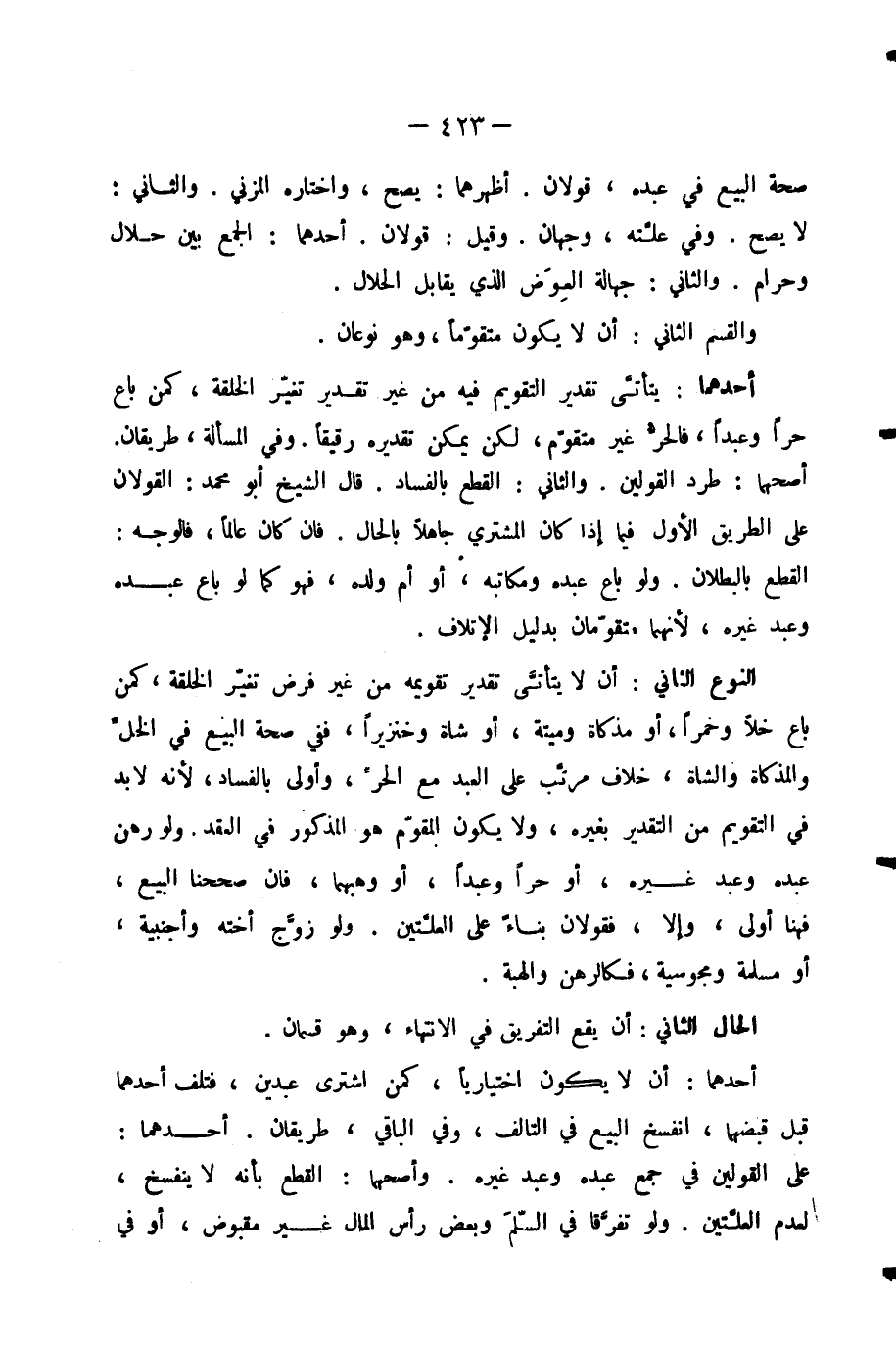 أَحَدُهُمَا: يَتَأَتَّى تَقْدِيرُ التَّقْوِيمِ فِيهِ مِنْ غَيْرِ تَقْدِيرِ تَغَيُّرِ الْخِلْقَةِ، كَمَنْ بَاعَ حُرًّا وَعَبْدًا، فَالْحُرُّ غَيْرُ مُتَقَوَّمٍ، لَكِنْ يُمْكِنُ تَقْدِيرُهُ رَقِيقًا. وَفِي الْمَسْأَلَةِ طَرِيقَانِ. أَصَحُّهُمَا: طَرْدُ الْقَوْلَيْنِ. وَالثَّانِي: الْقَطْعُ بِالْفَسَادِ. قَالَ الشَّيْخُ أَبُو مُحَمَّدٍ: الْقَوْلَانِ عَلَى الطَّرِيقِ الْأَوَّلِ فِيمَا إِذَا كَانَ الْمُشْتَرِي جَاهِلًا بِالْحَالِ. فَإِنْ كَانَ عَالِمًا فَالْوَجْهُ: الْقَطْعُ بِالْبُطْلَانِ. وَلَوْ بَاعَ عَبْدَهُ وَمُكَاتَبَهُ، أَوْ أُمَّ وَلَدِهِ، فَهُوَ كَمَا لَوْ بَاعَ عَبْدَهُ وَعَبْدَ غَيْرِهِ؛ لِأَنَّهُمَا مُتَقَوَّمَانِ بِدَلِيلِ الْإِتْلَافِ.
