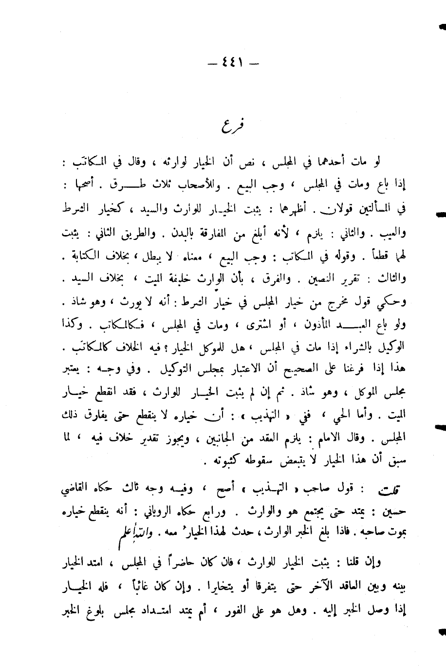 قُلْتُ: قَوْلُ صَاحِبِ «التَّهْذِيبِ» أَصَحُّ، وَفِيهِ وَجْهٌ ثَالِثٌ حَكَاهُ الْقَاضِي حُسَيْنٌ: يَمْتَدُّ حَتَّى يَجْتَمِعَ هُوَ وَالْوَارِثُ. وَرَابِعٌ حَكَاهُ الرُّويَانِيُّ: أَنَّهُ يَنْقَطِعُ خِيَارُهُ بِمَوْتِ صَاحِبِهِ. فَإِذَا بَلَغَ الْخَبَرُ الْوَارِثَ، حَدَثَ لِهَذَا الْخِيَارُ مَعَهُ. وَاللَّهُ أَعْلَمُ.