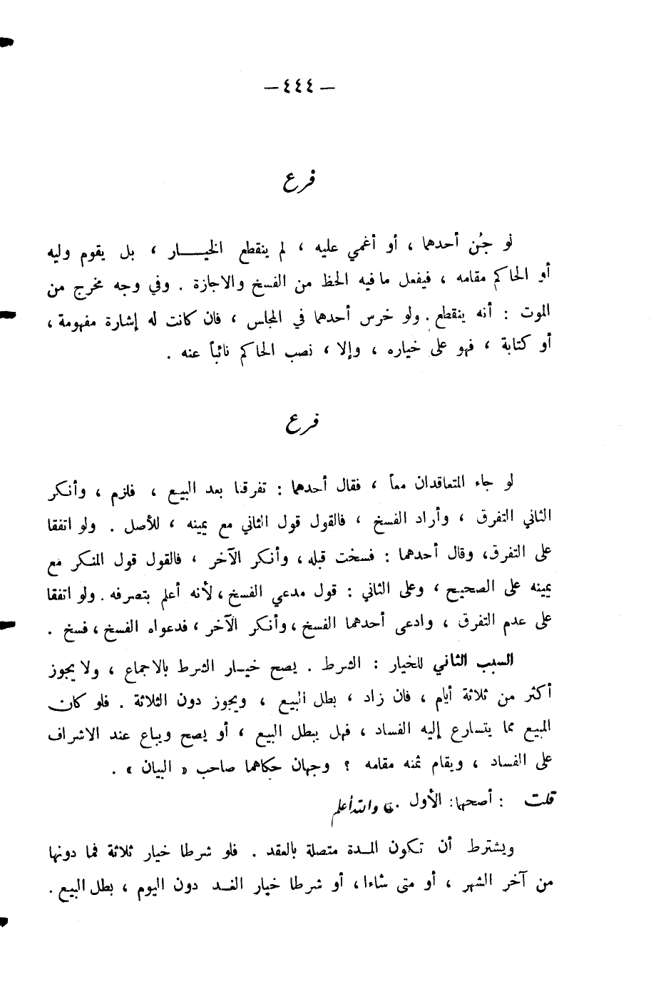 لَوْ جَاءَ الْمُتَعَاقِدَانِ مَعًا، فَقَالَ أَحَدُهُمَا: تَفَرَّقَنَا بَعْدَ الْبَيْعِ، فَلَزِمَ، وَأَنْكَرَ الثَّانِي التَّفَرُّقَ، وَأَرَادَ الْفَسْخَ، فَالْقَوْلُ قَوْلُ الثَّانِي مَعَ يَمِينِهِ، لِلْأَصْلِ. وَلَوِ اتَّفَقَا عَلَى التَّفَرُّقِ، وَقَالَ أَحَدُهُمَا: فَسَخْتُ قَبْلَهُ، وَأَنْكَرَ الْآخَرُ، فَالْقَوْلُ قَوْلُ الْمُنْكِرِ مَعَ يَمِينِهِ عَلَى الصَّحِيحِ، وَعَلَى الثَّانِي: قَوْلُ مُدَّعِي الْفَسْخَ؛ لِأَنَّهُ أَعْلَمُ بِتَصَرُّفِهِ. وَلَوِ اتَّفَقَا عَلَى عَدَمِ التَّفَرُّقِ، وَادَّعَى أَحَدُهُمَا الْفَسْخَ، وَأَنْكَرَ الْآخَرُ، فَدَعْوَاهُ الْفَسْخَ فَسْخٌ. السَّبَبُ الثَّانِي لِلْخِيَارِ: الشَّرْطُ. يَصِحُّ خِيَارُ الشَّرْطِ بِالْإِجْمَاعِ، وَلَا يَجُوزُ أَكْثَرُ مِنْ ثَلَاثَةِ أَيَّامٍ، فَإِنَّ زَادَ بَطَلَ الْبَيْعُ، وَيَجُوزُ دُونَ الثَّلَاثَةِ. فَلَوْ كَانَ الْمَبِيعُ مِمَّا يَتَسَارَعُ إِلَيْهِ الْفَسَادُ، فَهَلْ يَبْطُلُ الْبَيْعُ أَوْ يَصِحُّ وَيُبَاعُ عِنْدَ الْإِشْرَافِ عَلَى الْفَسَادِ، وَيُقَامُ ثَمَنُهُ مَقَامَهُ؟ وَجْهَانِ حَكَاهُمَا صَاحِبُ «الْبَيَانِ» .