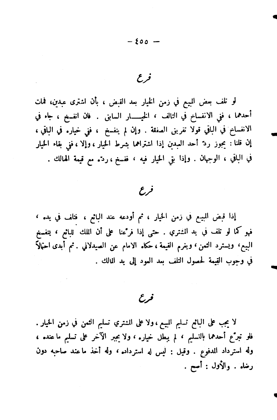 لَوْ تَلَفَ بَعْضُ الْمَبِيعِ فِي زَمَنِ الْخِيَارِ بَعْدَ الْقَبْضِ، بِأَنِ اشْتَرَى عَبْدَيْنِ، فَمَاتَ أَحَدُهُمَا، فَفِي الِانْفِسَاخِ فِي التَّالِفِ الْخِيَارُ السَّابِقُ. فَإِنِ انْفَسَخَ جَاءَ فِي الِانْفِسَاخِ فِي الْبَاقِي قَوْلَا تَفْرِيقِ الصَّفْقَةِ. وَإِنْ لَمْ يَنْفَسِخْ، فَفِي خِيَارِهِ فِي الْبَاقِي، إِنْ قُلْنَا: يَجُوزُ رَدُّ أَحَدِ الْعَبْدَيْنِ إِذَا اشْتَرَاهُمَا بِشَرْطِ الْخِيَارِ، وَإِلَّا فَفِي بَقَاءِ الْخِيَارِ فِي الْبَاقِي، الْوَجْهَانِ. وَإِذَا بَقِيَ الْخِيَارُ فِيهِ، فَفَسَخَ، رَدَّهُ مَعَ قِيمَةِ الْهَالِكِ.