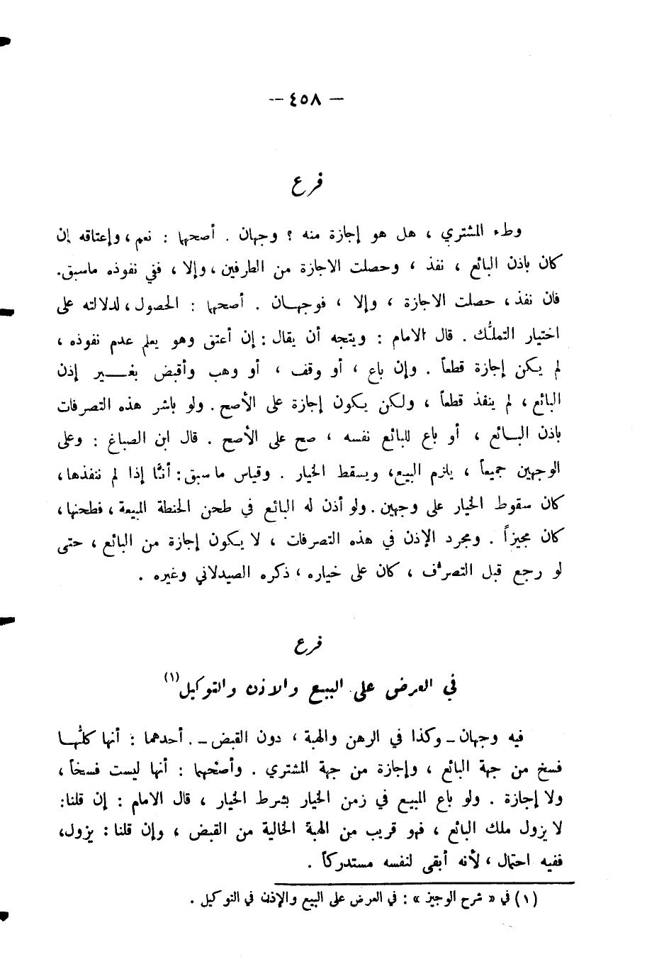 فِي الْعَرْضِ عَلَى الْبَيْعِ وَالْإِذْنِ وَالتَّوْكِيلِ فِيهِ وَجْهَانِ وَكَذَا فِي الرَّهْنِ وَالْهِبَةِ دُونَ الْقَبْضِ. أَحَدُهُمَا: أَنَّهَا كُلَّهَا فَسْخٌ مِنْ جِهَةِ الْبَائِعِ، وَإِجَازَةٌ مِنْ جِهَةِ الْمُشْتَرِي. وَأَصَحُّهُمَا: أَنَّهَا لَيْسَتْ فَسْخًا، وَلَا إِجَازَةً. وَلَوْ بَاعَ الْمَبِيعَ فِي زَمَنِ الْخِيَارِ بِشَرْطِ الْخِيَارِ، قَالَ الْإِمَامُ: إِنْ قُلْنَا: لَا يَزُولُ مِلْكُ الْبَائِعِ، فَهُوَ قَرِيبٌ مِنَ الْهِبَةِ الْخَالِيَةِ مِنَ الْقَبْضِ، وَإِنْ قُلْنَا: يَزُولُ، فَفِيهِ احْتِمَالٌ؛ لِأَنَّهُ أَبْقَى لِنَفْسِهِ مُسْتَدْرَكًا.