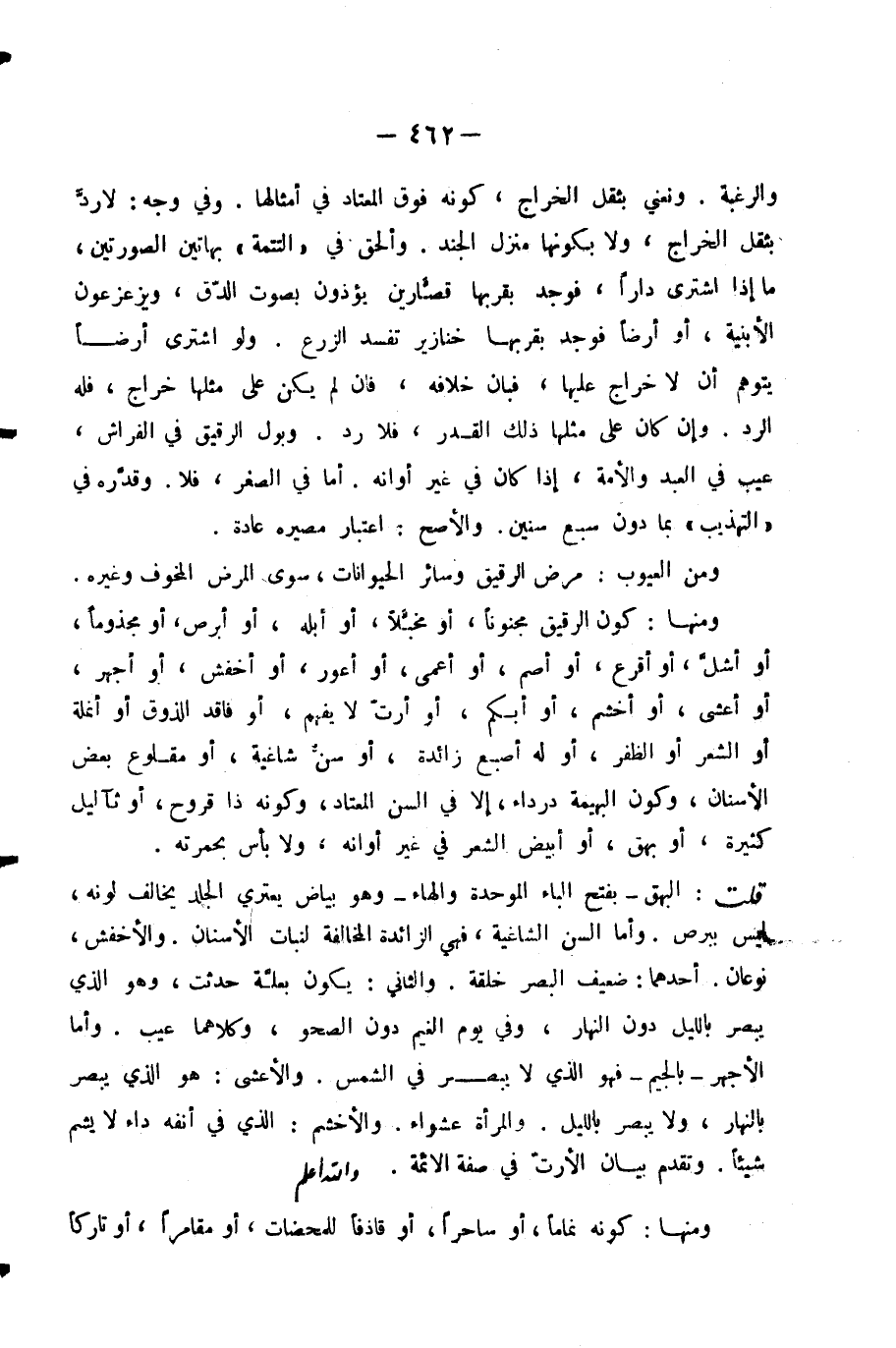 وَبَوْلُ الرَّقِيقِ فِي الْفِرَاشِ، عَيْبٌ فِي الْعَبْدِ وَالْأَمَةِ، إِذَا كَانَ فِي غَيْرِ أَوَانِهِ. أَمَّا فِي الصِّغَرِ، فَلَا. وَقَدَّرَهُ فِي «التَّهْذِيبِ» بِمَا دُونَ سَبْعِ سِنِينَ. وَالْأَصَحُّ: اعْتِبَارُ مَصِيرِهِ عَادَةً. وَمِنَ الْعُيُوبِ: مَرَضُ الرَّقِيقِ وَسَائِرِ الْحَيَوَانَاتِ، سِوَى الْمَرَضِ الْمَخُوفِ وَغَيْرِهِ. وَمِنْهَا: كَوْنُ الرَّقِيقِ مَجْنُونًا، أَوْ مُخَبَّلًا، أَوْ أَبْلَهَ، أَوْ أَبْرَصَ، أَوْ مَجْذُومًا، أَوْ أَشَلَّ، أَوْ أَقْرَعَ، أَوْ أَصَمَّ، أَوْ أَعْمَى، أَوْ أَعْوَرَ، أَوْ أَخْفَشَ، أَوْ أَجْهَرَ، أَوْ أَعْشَى، أَوْ أَخْشَمَ، أَوْ أَبْكَمَ، أَوْ أَرَتَّ لَا يُفْهِمُ، أَوْ فَاقِدَ الذَّوْقِ أَوْ أُنْمُلَةٍ أَوِ الشَّعْرِ أَوِ الظُّفْرِ، أَوْ لَهُ أُصْبُعٌ زَائِدَةٌ، أَوْ سِنٌّ شَاغِيَةٌ، أَوْ مَقْلُوعَ بَعْضِ الْأَسْنَانِ، وَكَوْنُ الْبَهِيمَةِ دَرْدَاءَ، إِلَّا فِي السَّنِّ الْمُعْتَادِ، وَكَوْنُهُ ذَا قُرُوحٍ أَوْ ثَآلِيلٍ كَثِيرَةٍ، أَوْ بَهَقٍ، أَوْ أَبْيَضَ الشَّعْرِ فِي غَيْرِ أَوَانِهِ، وَلَا بَأْسَ بِحُمْرَتِهِ.