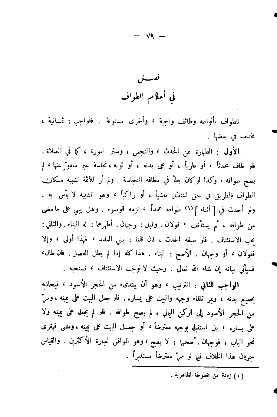 الْأَوَّلُ: الطَّهَارَةُ عَنِ الْحَدَثِ، وَالنَّجَسِ، وَسَتْرُ الْعَوْرَةِ، كَمَا فِي الصَّلَاةِ. فَلَوْ طَافَ مُحْدِثًا، أَوْ عَارِيًا، أَوْ عَلَى بَدَنِهِ أَوْ ثَوْبِهِ نَجَاسَةٌ غَيْرُ مَعْفُوٍّ عَنْهَا لَمْ يَصِحَّ طَوَافُهُ، وَكَذَا لَوْ كَانَ يَطَأُ فِي مَطَافِهِ النَّجَاسَةَ. وَلَمْ أَرَ لِلْأَئِمَّةِ تَشْبِيهَ مَكَانِ الطَّوَافِ بِالطَّرِيقِ فِي حَقِّ الْمُتَنَفِّلِ مَاشِيًا أَوْ رَاكِبًا، وَهُوَ تَشْبِيهٌ لَا بَأْسَ بِهِ. وَلَوْ أَحْدَثَ فِي أَثْنَاءِ طَوَافِهِ عَمْدًا، لَزِمَهُ الْوُضُوءُ. وَهَلْ يَبْنِي عَلَى مَا مَضَى مِنْ طَوَافِهِ، أَمْ يَسْتَأْنِفُ؟ قَوْلَانِ. وَقِيلَ: وَجْهَانِ. أَظْهَرُهُمَا: لَهُ الْبِنَاءُ.