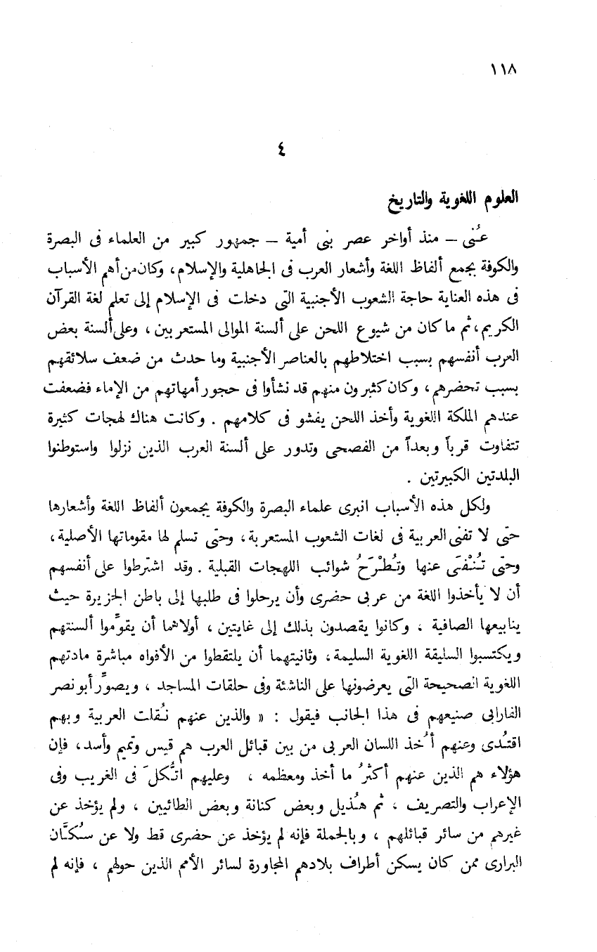 ولكل هذه الأسباب انبرى علماء البصرة والكوفة يجمعون ألفاظ اللغة وأشعارها حتى لا تفنى العربية فى لغات الشعوب المستعربة، وحتى تسلم لها مقوماتها الأصلية، وحتى تنفى عنها وتطرح شوائب اللهجات القبلية. وقد اشترطوا على أنفسهم أن لا يأخذوا اللغة من عربى حضرى وأن يرحلوا فى طلبها إلى باطن الجزيرة حيث ينابيعها الصافية. وكانوا يقصدون بذلك إلى غايتين، أولاهما أن يقوّموا ألسنتهم ويكتسبوا السليقة اللغوية السليمة، وثانيتهما أن يلتقطوا من الأفواه مباشرة مادتهم اللغوية الصحيحة التى يعرضونها على الناشئة وفى حلقات المساجد، ويصوّر أبو نصر الفارابى صنيعهم فى هذا الجانب فيقول: «والذين عنهم نقلت العربية وبهم اقتدى وعنهم أخذ اللسان العربى من بين قبائل العرب هم قيس وتميم وأسد، فإن هؤلاء هم الذين عنهم أكثر ما أخذ ومعظمه، وعليهم اتّكل فى الغريب وفى الإعراب والتصريف، ثم هذيل وبعض كنانة وبعض الطائيين، ولم يؤخذ عن غيرهم من سائر قبائلهم، وبالجملة فإنه لم يؤخذ عن حضرى قط ولا عن سكّان البرارى ممن كان يسكن أطراف بلادهم المجاورة لسائر الأمم الذين حولهم، فإنه لم