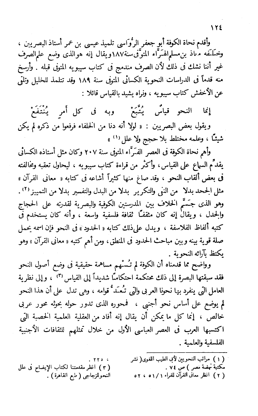 وواضح مما قدمناه أن الكوفة لم تسهم مساهمة حقيقية فى وضع أصول النحو فقد سبقتها البصرة إلى ذلك محتكمة احتكاما شديدا إلى القياس (¬3)، وإلى نظرية العامل التى ينفرد بها نحونا العربى والتى تعدّ قوامه، وهى تدل على أن هذا النحو لم يوضع على أساس نحو أجنبى، فمحوره الذى تدور حوله بحوثه محور عربى خالص، إنما كل ما يمكن أن يقال إنه أفاد من العقلية العلمية الخصبة التى اكتسبها العرب فى العصر العباسى الأول من خلال تمثلهم للثقافات الأجنبية الفلسفية والعلمية.