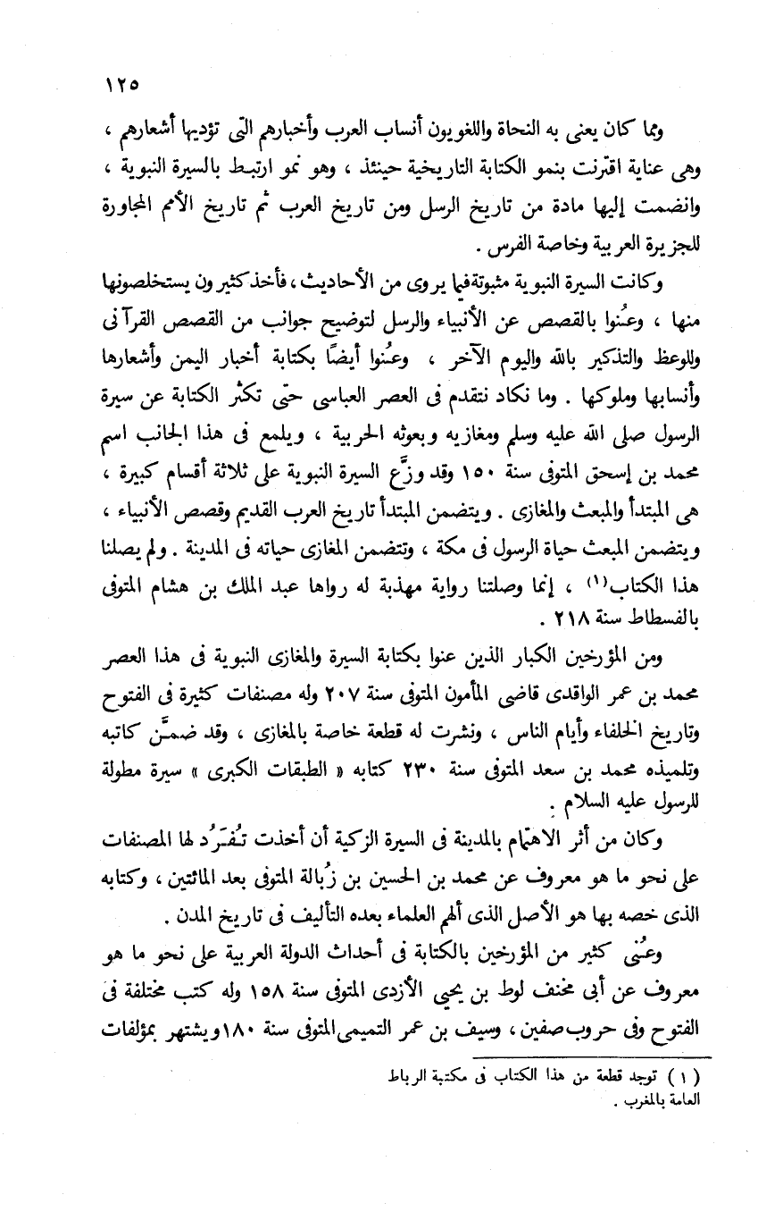 وكانت السيرة النبوية مثبوتة فيما يروى من الأحاديث، فأخذ كثيرون يستخلصونها منها، وعنوا بالقصص عن الأنبياء والرسل لتوضيح جوانب من القصص القرآنى والوعظ والتذكير بالله واليوم الآخر، وعنوا أيضا بكتابة أخبار اليمن وأشعارها وأنسابها وملوكها. وما نكاد نتقدم فى العصر العباسى حتى تكثر الكتابة عن سيرة الرسول صلى الله عليه وسلم ومغازيه وبعوثه الحربية، ويلمع فى هذا الجانب اسم محمد بن إسحق المتوفى سنة 150 وقد وزّع السيرة النبوية على ثلاثة أقسام كبيرة، هى المبتدأ والمبعث والمغازى. ويتضمن المبتدأ تاريخ العرب القديم وقصص الأنبياء، ويتضمن المبعث حياة الرسول فى مكة، وتتضمن المغازى حياته فى المدينة. ولم يصلنا هذا الكتاب (¬1)، إنما وصلتنا رواية مهذبة له رواها عبد الملك بن هشام المتوفى بالفسطاط سنة 218.