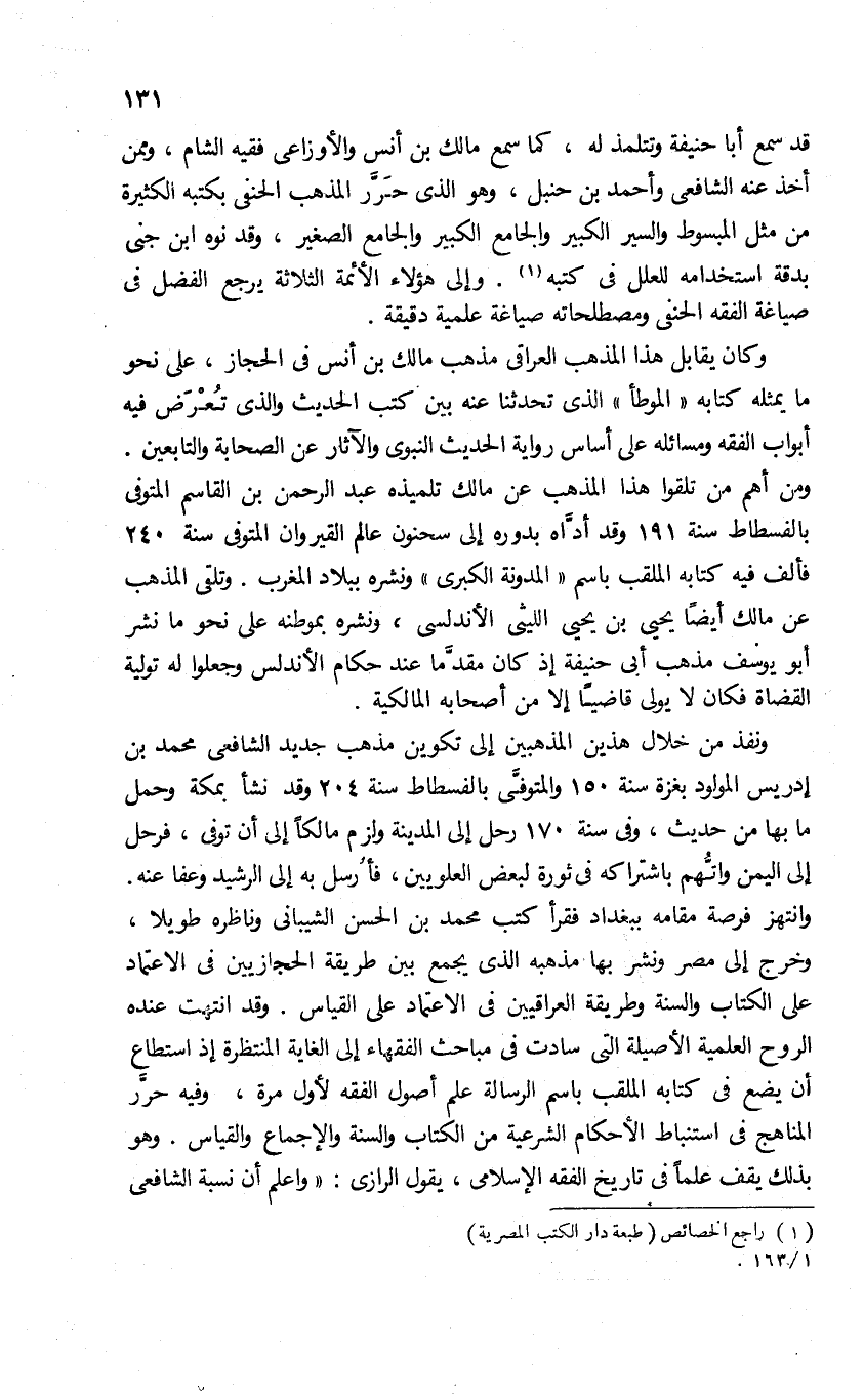 قد سمع أبا حنيفة وتتلمذ له، كما سمع مالك بن أنس والأوزاعى فقيه الشام، وممن أخذ عنه الشافعى وأحمد بن حنبل، وهو الذى حرّر المذهب الحنفى بكتبه الكثيرة من مثل المبسوط والسير الكبير والجامع الكبير والجامع الصغير، وقد نوه ابن جنى بدقة استخدامه للعلل فى كتبه (¬1). وإلى هؤلاء الأئمة الثلاثة يرجع الفضل فى صياغة الفقه الحنفى ومصطلحاته صياغة علمية دقيقة.
