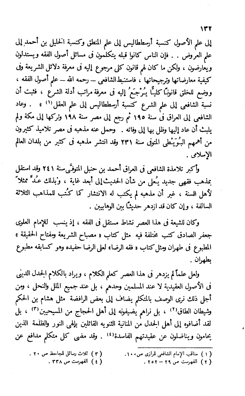 إلى علم الأصول كنسبة أرسططاليس إلى علم المنطق وكنسبة الخليل بن أحمد إلى علم العروض. . فإن الناس كانوا قبله يتكلمون فى مسائل أصول الفقه ويستدلون ويعارضون، ولكن ما كان لهم قانون كلى مرجوع إليه فى معرفة دلائل الشريعة وفى كيفية معارضاتها وترجيحاتها، فاستنبط الشافعى-رحمه الله-علم أصول الفقه، ووضع للخلق قانونا كليّا يرجع إليه فى معرفة مراتب أدلة الشرع، فثبت أن نسبة الشافعى إلى علم الشرع كنسبة أرسططاليس إلى علم العقل (¬1)». وعاد الشافعى إلى العراق فى سنة 195 ثم رجع إلى مصر سنة 198 وتركها إلى مكة ولم يلبث أن عاد إليها وظل بها إلى وفاته. وحمل عنه مذهبه فى مصر تلاميذ كثيرون من أهمهم البويطى المتوفى سنة 231 وقد انتشر مذهبه فى كثير من بلدان العالم الإسلامى.