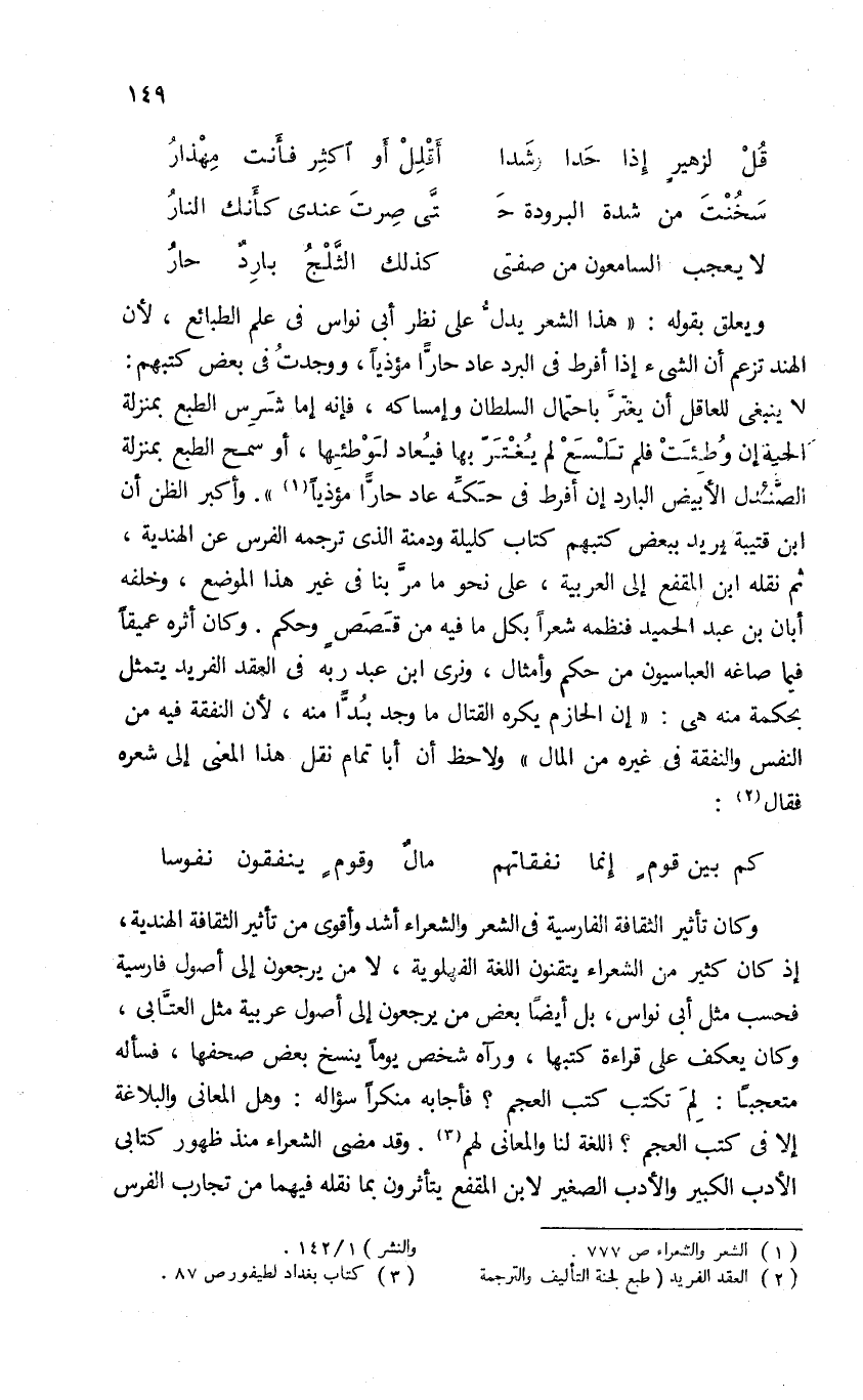 ويعلق بقوله: «هذا الشعر يدلّ على نظر أبى نواس فى علم الطبائع، لأن الهند تزعم أن الشئ إذا أفرط فى البرد عاد حارّا مؤذيا، ووجدت فى بعض كتبهم: