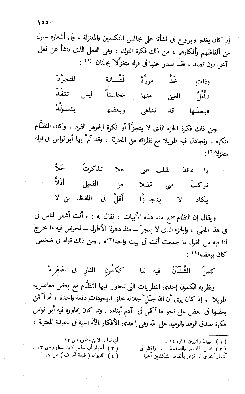 ومن ذلك فكرة الجزء الذى لا يتجزّأ أو فكرة الجوهر الفرد، وكان النظّام ينكره، وتجادل فيه طويلا مع نظرائه من المعتزلة، وقد ألمّ بها أبو نواس فى قوله متغزلا (¬2):