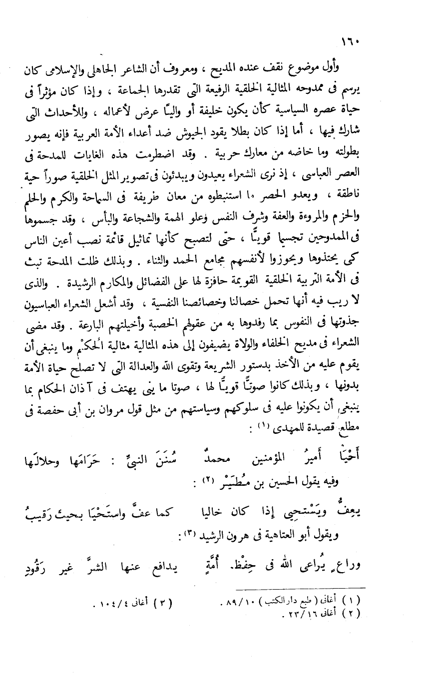 وأول موضوع نقف عنده المديح، ومعروف أن الشاعر الجاهلى والإسلامى كان يرسم فى ممدوحه. المثالية الخلقية الرفيعة التى تقدرها الجماعة، وإذا كان مؤثرا فى حياة عصره السياسية كأن يكون خليفة أو واليا عرض لأعماله، وللأحداث التى شارك فيها. أما إذا كان بطلا يقود الجيوش ضد أعداء الأمة العربية فإنه يصور بطولته وما خاضه من معارك حربية. وقد اضطرمت هذه الغايات للمدحة فى العصر العباسى، إذ نرى الشعراء يعيدون ويبدئون فى تصوير المثل الخلقية صورا حية ناطقة، ويعدو الحصر ما استنبطوه من معان طريفة فى السماحة والكرم والحلم والحزم والمروءة والعفة وشرف النفس وعلو الهمة والشجاعة والبأس، وقد جسموها فى الممدوحين تجسيما قويّا، حتى لتصبح كأنها تماثيل قائمة نصب أعين الناس كى يحتذوها ويحوزوا لأنفسهم مجامع الحمد والثناء. وبذلك ظلت المدحة تبث فى الأمة التربية الخلقية القويمة حافزة لها على الفضائل والمكارم الرشيدة. والذى لا ريب فيه أنها تحمل خصالنا وخصائصنا النفسية، وقد أشعل الشعراء العباسيون جذوتها فى النفوس بما رفدوها به من عقولهم الخصبة وأخيلتهم البارعة. وقد مضى الشعراء فى مديح الخلفاء والولاة يضيفون إلى هذه المثالية مثالية الحكم وما ينبغى أن يقوم عليه من الأخذ بدستور الشريعة وتقوى الله والعدالة التى لا تصلح حياة الأمة بدونها، وبذلك كانوا صوتّا قويّا لها، صوتا ما بنى يهتف فى آذان الحكام بما ينبغى أن يكونوا عليه فى سلوكهم وسياستهم من مثل قول مروان بن أبى حفصة فى مطلع قصيدة للمهدى (¬1):
