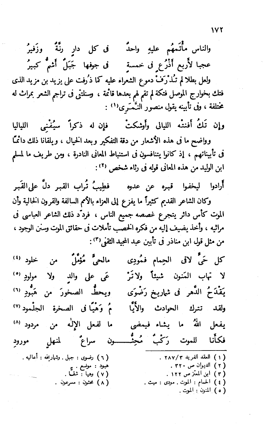 وكان الشاعر القديم كثيرا ما يفزع إلى العزاء بالأمم السالفة والقرون الخالية وأن الموت كأس دائر يتجرع غصصه جميع الناس، فردّد ذلك الشاعر العباسى فى مراثيه، وأخذ يضيف إليه من فكره الخصب تأملات فى حقائق الموت وسنن الوجود، من مثل قول ابن مناذر فى تأبين عبد المجيد الثقفى (¬3):