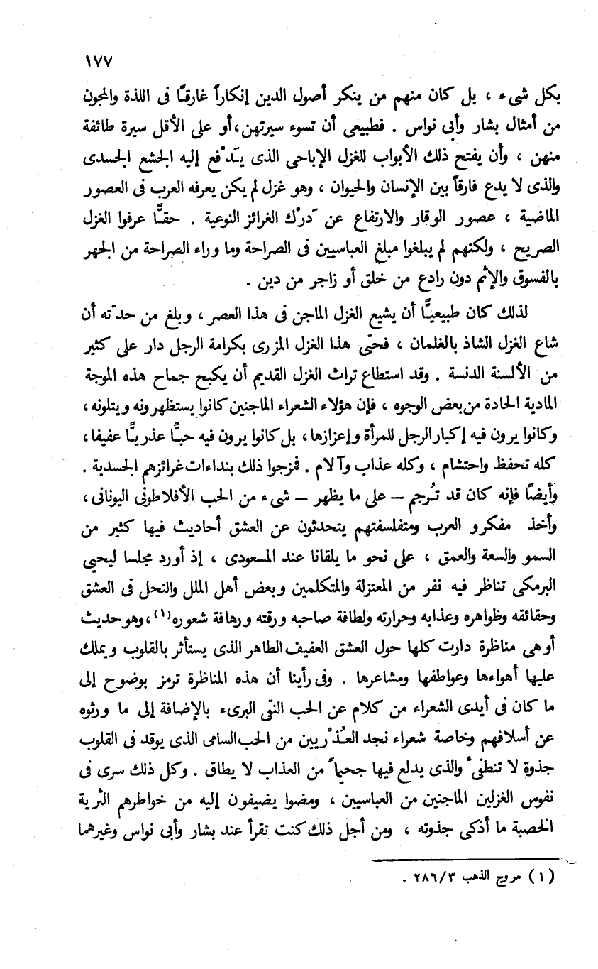 وأيضا فإنه كان قد ترجم-على ما يظهر-شئ من الحب الأفلاطونى اليونانى، وأخذ مفكرو العرب ومتفلسفتهم يتحدثون عن العشق أحاديث فيها كثير من السمو والسعة والعمق، على نحو ما يلقانا عند المسعودى، إذ أورد مجلسا ليحيى البرمكى تناظر فيه نفر من المعتزلة والمتكلمين وبعض أهل الملل والنحل فى العشق وحقائقه وظواهره وعذابه وحرارته ولطافة صاحبه ورقته ورهافة شعوره (¬1)، وهو حديث أو هى مناظرة دارت كلها حول العشق العفيف الطاهر الذى يستأثر بالقلوب ويملك عليها أهواءها وعواطفها ومشاعرها. وفى رأينا أن هذه المناظرة ترمز بوضوح إلى ما كان فى ايدى الشعراء من كلام عن الحب النقى البرئ بالإضافة إلى ما وروه عن أسلافهم وخاصة شعراء نجد العذريين من الحب السامى الذى يوقد فى القلوب جذوة لا تنطفئ والذى يدلع فيها جحيما من العذاب لا يطاق. وكل ذلك سرى فى نفوس الغزلين الماجنين من العباسيين، ومضوا يصيفون إليه من خواطرهم الثرية الخصبة ما أذكى جذوته، ومن أجل ذلك كنت تقرأ عند بشار وأبى نواس وغيرهما
