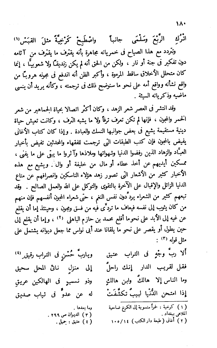 وتتردد مع هذا الصياح فى خمرياته مجاهرة بأنه يقترف ما يقترف من آثامه دون تفكير فى جنة أو نار، ولكن من الحق أنه لم يكن زنديقا ولا شعوبيّا، إنما كان متحلل الأخلاق ساقط المرءوة. وأكبر الظن أنه اندفع فى مجونه هروبا من واقع نشأته وواقع أمه على نحو ما سنوضح ذلك فى ترجمته، وكأنه يريد أن ينسى ماضيه وذكرياته السيئة.