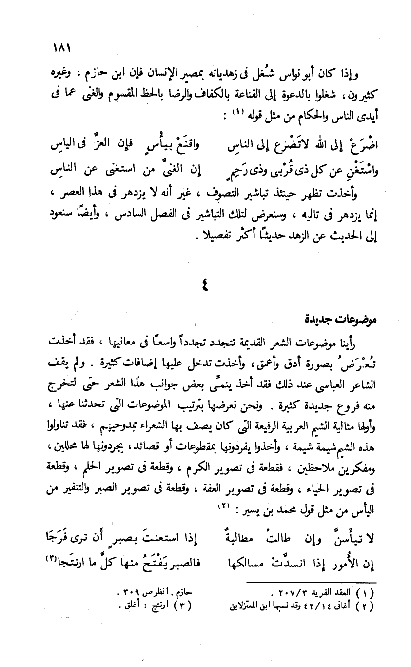 رأينا موضوعات الشعر القديمة تتجدد تجددا واسعا فى معانيها، فقد أخذت تعرض بصورة أدق وأعمق، وأخذت تدخل عليها إضافات كثيرة. ولم يقف الشاعر العباسى عند ذلك فقد أخذ ينمّى بعض جوانب هذا الشعر حتى لتخرج منه فروع جديدة كثيرة. ونحن نعرضها بترتيب الموضوعات التى تحدثنا عنها، وأولها مثالية الشيم العربية الرفيعة التى كان يصف بها الشعراء ممدوحيهم، فقد تناولوا هذه الشيم شيمة شيمة، وأخذوا يفردونها بمقطوعات أو قصائد، يجردونها لها محللين، ومفكرين ملاحظين، فقطعة فى تصوير الكرم، وقطعة فى تصوير الحلم، وقطعة فى تصوير الحياء، وقطعة فى تصوير العفة، وقطعة فى تصوير الصبر والتنفير من اليأس من مثل قول محمد بن يسير: (¬2)