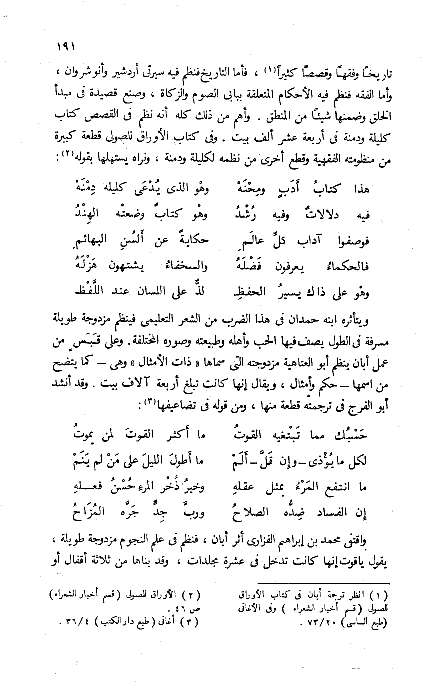 تاريخا وفقها وقصصا كثيرا (¬1)، فأما التاريخ فنظم فيه سيرتى أردشير وأنوشروان، وأما الفقه فنظم فيه الأحكام المتعلقة ببابى الصوم والزكاة، وصنع قصيدة فى مبدأ الخلق وضمنها شيئا من المنطق. وأهم من ذلك كله أنه نظم فى القصص كتاب كليلة ودمنة فى أربعة عشر ألف بيت. وفى كتاب الأوراق للصولى قطعة كبيرة من منظومته الفقهية وقطع أخرى من نظمه لكليلة ودمنة، ونراه يستهلها بقوله (¬2):