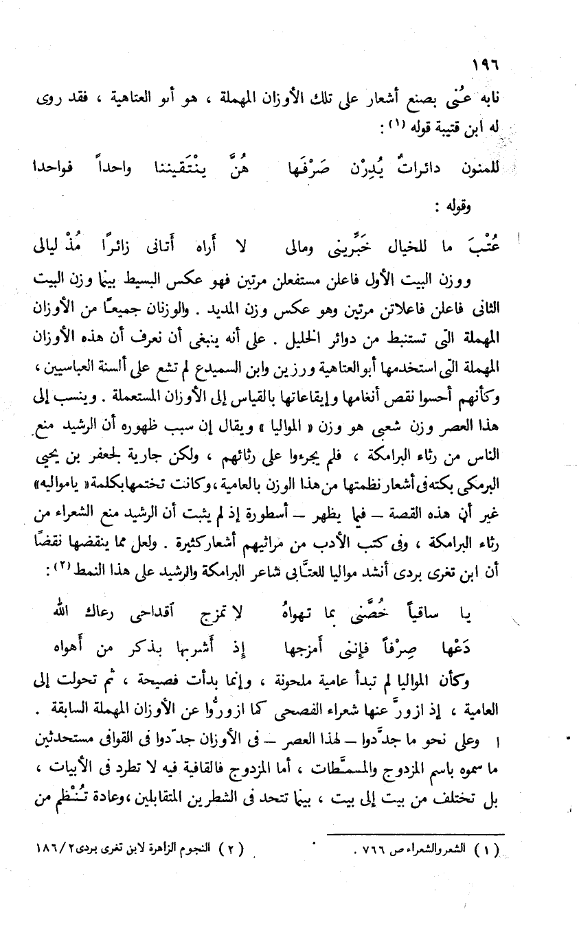 ووزن البيت الأول فاعلن مستفعلن مرتين فهو عكس البسيط بينما وزن البيت الثانى فاعلن فاعلاتن مرتين وهو عكس وزن المديد. والوزنان جميعا من الأوزان المهملة التى تستنط من دوائر الخليل. على أنه ينبغى أن نعرف أن هذه الأوزان المهملة التى استخدمها أبو العتاهية ورزين وابن السميدع لم تشع على ألسنة العباسيين، وكأنهم أحسوا نقص أنغامها وإيقاعاتها بالقياس إلى الأوزان المستعملة. وينسب إلى هذا العصر وزن شعبى هو وزن «المواليا» ويقال إن سبب ظهوره أن الرشيد منع الناس من رثاء البرامكة، فلم يجرءوا على رثائهم، ولكن جارية لجعفر بن يحيى البرمكى بكته فى أشعار نظمتها من هذا الوزن بالعامية، وكانت تختمها بكلمة «يامواليه» غير أن هذه القصة-فيما يظهر-أسطورة إذ لم يثبت أن الرشيد منع الشعراء من رثاء البرامكة، وفى كتب الأدب من مراثيهم أشعار كثيرة. ولعل مما ينقضها نقضا أن ابن تغرى بردى أنشد مواليا للعتّابى شاعر البرامكة والرشيد على هذا النمط (¬2):