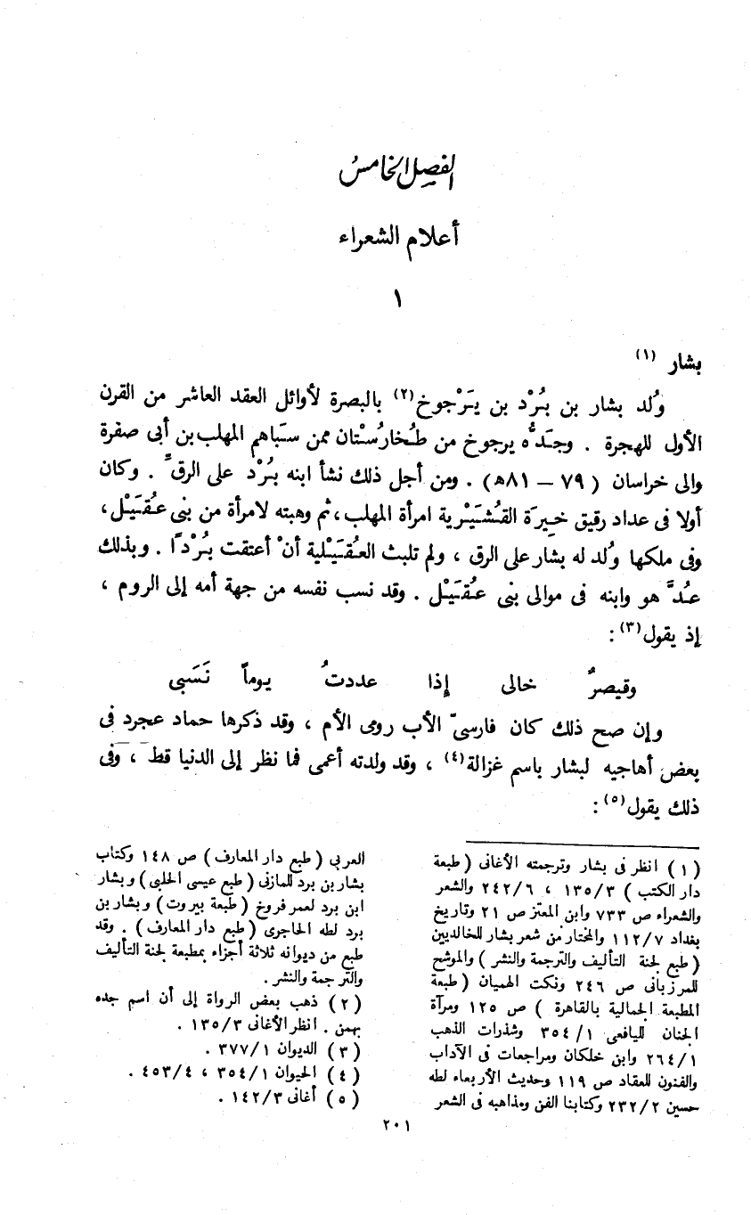 (¬1) انظر فى بشار وترجمته الأغانى (طبعة دار الكتب) 3/ 135، 6/ 242 والشعر والشعراء ص 733 وابن المعتز ص 21 وتاريخ بغداد 7/ 112 والمختار من شعر بشار للخالديين (طبع لجنة التأليف والترجمة والنشر) والموشح للمرزبانى ص 246 ونكت الهميان (طبعة المطبعة الجمالية بالقاهرة) ص 125 ومرآة الجنان لليافعى 1/ 354 وشذرات الذهب 1/ 264 وابن خلكان ومراجعات فى الآداب والفنون للعقاد ص 119 وحديث الأربعاء لطه حسين 2/ 232 وكتابنا الفن ومذاهبه فى الشعر العربى (طبع دار المعارف) ص 148 وكتاب بشار بن برد المازنى (طبع عيسى الحلبى) وبشار ابن برد لعمر فروخ (طبعة عيسى الحلبى) وبشار ابن برد لعمر فروخ (طبعة بيروت) وبشار بن برد لطه الحاجرى (طبع دار المعارف). وقد طبع من ديوانه ثلاثة أجزاء بمطبعة لجنة التأليف والترجمة والنشر.