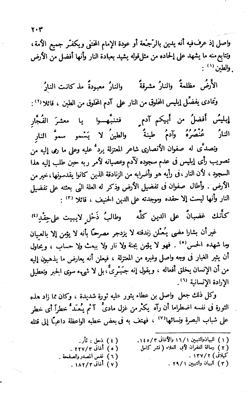 وتصدّى له صفوان الأنصارى شاعر المعتزلة يردّ عليه وعلى ما رمى إليه من تصويب رأى إبليس فى عدم سجوده لآدم وعصيانه لأمر ربه حين طلب إليه هذا السجود، لأن النار، فى رأيه هو وأضرابه من الزنادقة الذين كانوا يقدسونها، خير من الأرض. وأطال صفوان فى تفضيل الأرض وذكر له العلة التى بعثته على تفضيل النار وأنها ليست إلا حقده وموجدته على الدين الحنيف، قائلا (¬3):