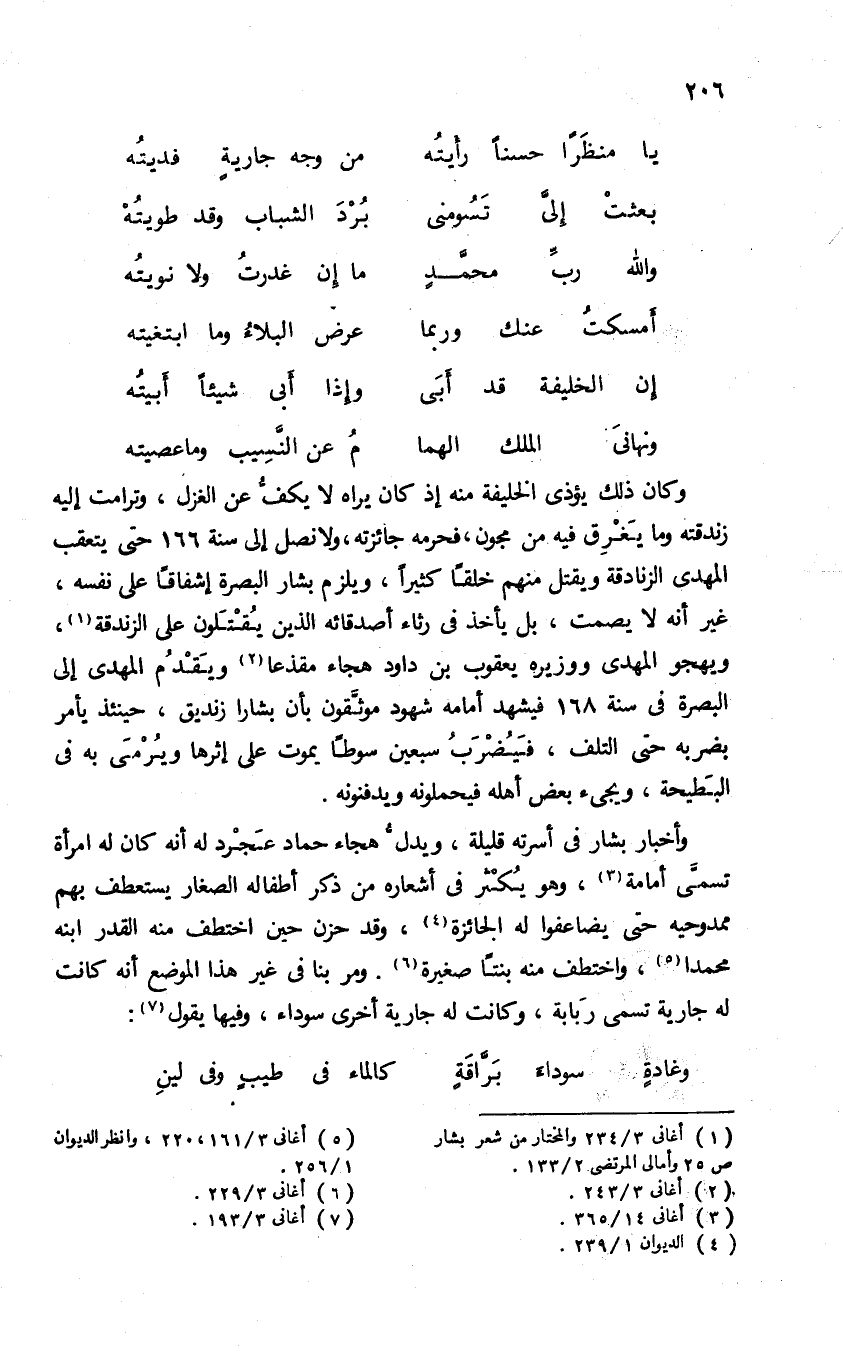 وكان ذلك يؤذى الخليفة منه إذ كان يراه لا يكفّ عن الغزل، وترامت إليه زندقته وما يغرق فيه من مجون، فحرمه جائزته، ولا نصل إلى سنة 166 حتى يتعقب المهدى الزنادقة ويقتل منهم خلقا كثيرا، ويلزم بشار البصرة إشفاقا على نفسه، غير أنه لا يصمت، بل يأخذ فى رثاء أصدقائه الذين يقتلون على الزندقة (¬1)، ويهجو المهدى ووزيره يعقوب بن داود هجاء مقذعا (¬2) ويقدم المهدى إلى البصرة فى سنة 168 فيشهد أمامه شهود موثّقون بأن بشارا زنديق، حينئذ يأمر بضربه حتى التلف، فيضرب سبعين سوطا يموت على إثرها ويرمى به فى البطيحة، ويجئ بعض أهله فيحملونه ويدفنونه.