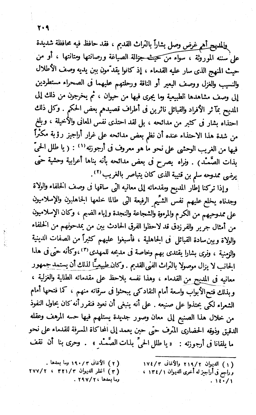 وإذا تركنا إطار المديح ومقدماته إلى معانيه التى ساقها فى وصف الخلفاء والولاة وجدناه يخلع عليهم نفس الشّيم الرفيعة التى طالما خلعها الجاهليون والإسلاميون على ممدوحيهم من الكرم والمرءوة والشجاعة والنجدة وإباء الضيم، وكان الإسلاميون من أمثال جرير والفرزدق قد لاحظوا الفرق الحادث بين من يمدحونهم من الخلفاء والولاة وبين سادة القبائل فى الجاهلية، فأسبغوا عليهم كثيرا من الصفات الدينية والزمنية، ونرى بشارا يقتدى بهم وخاصة فى مديحه للمهدى (¬3)، وكأنه حتى فى هذا الجانب لا يزال موصولا بالتراث الفنى القديم. وكان طبيعيّا لذلك أن يستمد جمهور معانيه فى المديح من القدماء، وهذا نفسه يلاحظ على مقدماته الطللية والغزلية، وبذلك فتح الأبواب واسعة أمام النقاد كى يبحثوا فى سرقاته منهم، كما فتحها أمام الشعراء لكى يحتذوا على صيعه. على أنه ينبغى أن نعود فنقرر أنه كان يحاول النفوذ من خلال هذا الصنيع إلى معان وصور جديدة يستلهم فيها حسه المرهف وعقله الدقيق وذوقه الحضارى المترف حتى حين يعمد إلى المحاكاة المسرفة للقدماء على نحو ما يلقانا فى أرجوزته: «يا طلل الحىّ بذات الصّمد». وحرى بنا أن نقف