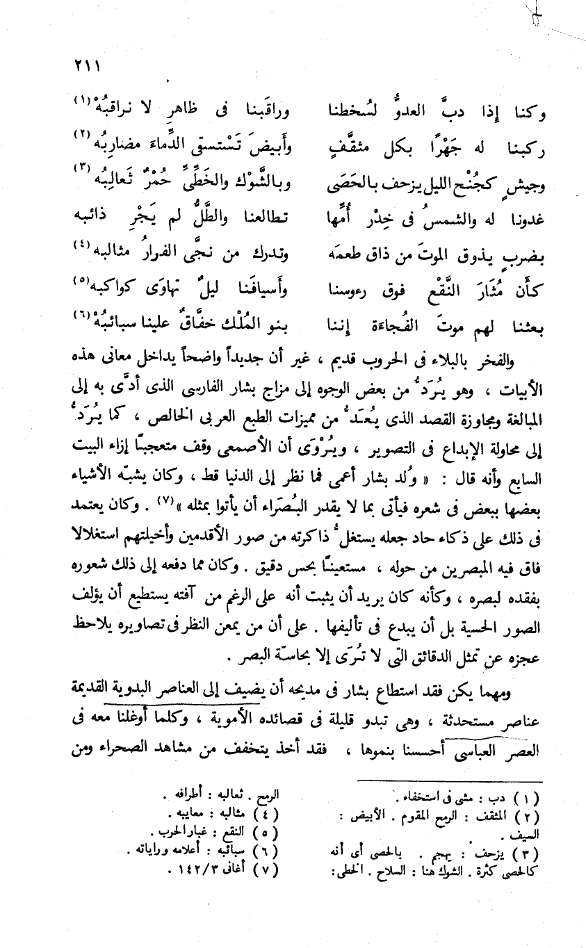 والفخر بالبلاء فى الحروب قديم، غير أن جديدا واضحا يداخل معانى هذه الأبيات، وهو يردّ من بعض الوجوه إلى مزاج بشار الفارسى الذى أدّى به إلى المبالغة ومجاوزة القصد الذى يعدّ من مميزات الطبع العربى الخالص، كما يردّ إلى محاولة الإبداع فى التصوير، ويروى أن الأصمعى وقف متعجبا إزاء البيت السابع وأنه قال: «ولد بشار أعمى فما نظر إلى الدنيا قط، وكان يشبّه الأشياء بعضها ببعض فى شعره فيأتى بما لا يقدر البصراء أن يأتوا بمثله» (¬7). وكان يعتمد فى ذلك على ذكاء حاد جعله يستغلّ ذاكرته من صور الأقدمين وأخيلتهم استغلالا فاق فيه المبصرين من حوله، مستعينا بحس دقيق. وكان مما دفعه إلى ذلك شعوره بفقده لبصره، وكأنه كان يريد أن يثبت أنه على الرغم من آفته يستطيع أن يؤلف الصور الحسية بل أن يبدع فى تأليفها. على أن من يمعن النظر فى تصاويره يلاحظ عجزه عن تمثل الدقائق التى لا ترى إلا بحاسّة البصر.