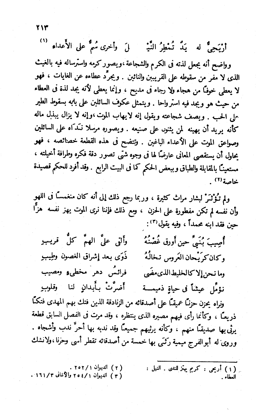 وواضح أنه يجعل لذته فى الكرم والشجاعة، ويصور كرمه واسترساله فيه بالغيث الذى لا مفر من سقوطه على القريبين والنائين. ويجرّد عطاءه عن الغايات، فهو لا يعطى خوفا من هجاء ولا رجاء فى مديح، وإنما يعطى لأنه يجد لذة فى العطاء من حيث هو ويجد فيه استرواحا. ويتمثل عكوف السائلين على بابه بسقوط الطير على الحب. ويصف شجاعته ويقول إنه لا يهاب الموت، وإنه لا يزال يبذل ماله كأنه يريد أن يهينه لمن يثنون على صنيعه. ويصوره مرسلا نداه على السائلين وصواعق الموت على الأعداء الباغين. وتتضح فى هذه القطعة خصائصه، فهو يحاول أن يستقصى المعانى عارضا لها فى وجوه شتى تصور دقة فكره وطرافة أخيلته، مستعينا بالمقابلة والطباق وببعض الحكم كما فى البيت الرابع. وقد أفرد للحكم قصيدة خاصة (¬2).