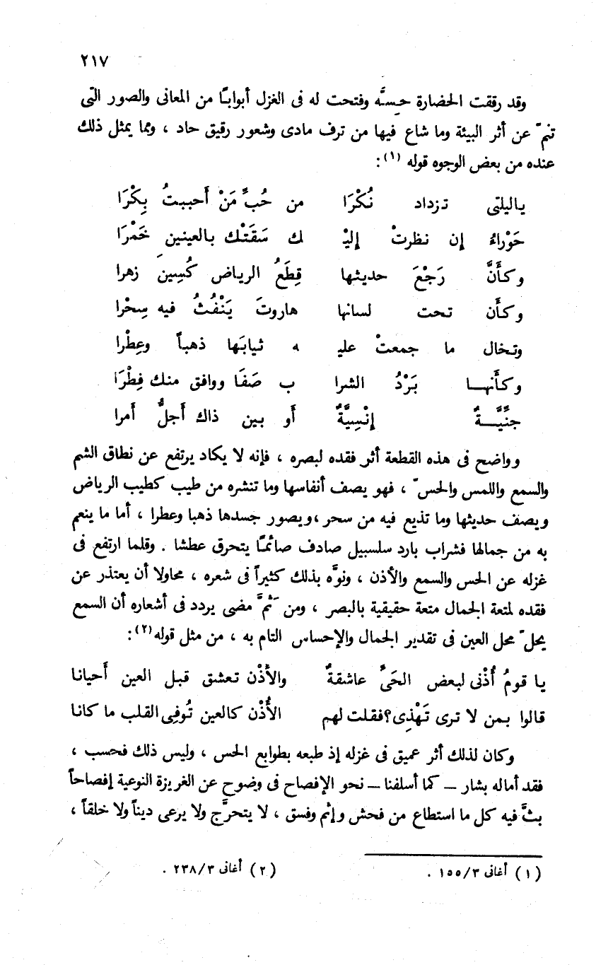 وقد رققت الحضارة حسّه وفتحت له فى الغزل أبوابا من المعانى والصور التى تمّ عن أثر البيئة وما شاع فيها من ترف مادى وشعور رقيق حاد، ومما يمثل ذلك عنده من بعض الوجوه قوله (¬1):