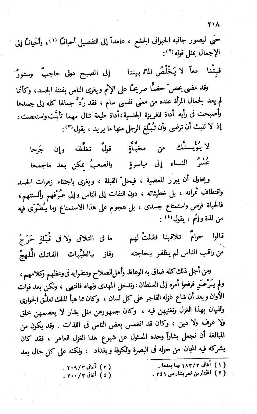 وقد مضى يحضّ حضّا صريحا على الإثم ويغرى الناس بفتنة الجسد، وكأنما لم يعد لجمال المرأة عنده من معنى نفسى سام، فقد ردّ جمالها كله إلى جسدها وأصبحت فى رأيه أداة للغريزة الجنسية، أداة طيعة تنال مهما تأبّت واستعصت، إذ لا تلبث أن ترضى وأن تبلغ الرجل منها ما يريد، يقول (¬3):