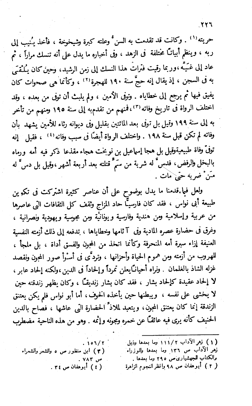 ولعل فيما قدمنا ما يدل بوضوح على أن عناصر كثيرة اشتركت فى تكوين طبيعة أبى نواس، فقد كان فارسيّا حاد المزاج وثقف كل الثقافات التى عاصرها من عربية وإسلامية ومن هندية وفارسية ويونانية ومن مجوسية ويهودية ونصرانية، وغرق فى حضارة عصره المادية وفى آثامها وخطاياها، تدفعه إلى ذلك أزمته النفسية العنيفة إزاء سيرة أمه المنحرفة وكأنما اتخذ من المجون والفسق أداة، بل ملجأ، للهروب من أزمته ومن هموم الحياة وأحزانها، وتردّى فى أسوأ صور المجون ونقصد غزله الشاذ بالغلمان. ونراه أحيانا يعلن تمردا وإلحادا فى الدين، ولكنه إلحاد عابر، لا إلحاد عقيدة كإلحاد بشار، فقد كان بشار زنديقا، وكان يظهر زندقته حين لا يخشى على نفسه، ويبطنها حين يأخذه الخوف، أما أبو نواس فلم يكن يعتنق الزندقة إنما كان يعتنق المجون، ويتعبد لملاذ الحضارة التى عاشها، فصاح بالدين الحنيف كأنه يرى فيه عائقا عن خمره ومجونه وإثمه. وهو من هذه الناحية مضطرب