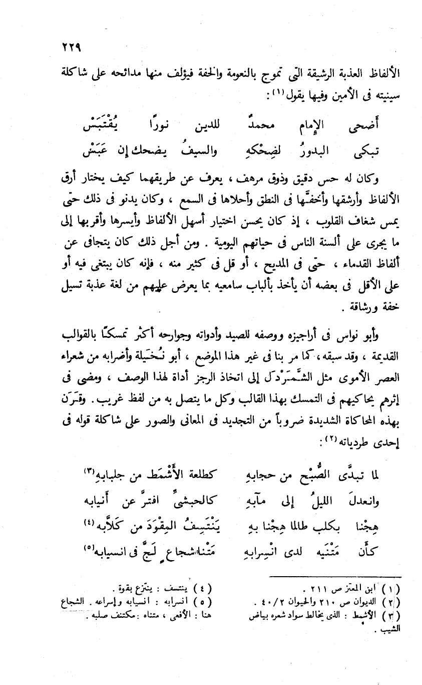الألفاظ العذبة الرشيقة التى تموج بالنعومة والخفة فيؤلف منها مدائحه على شاكلة سينيته فى الأمين وفيها يقول (¬1):