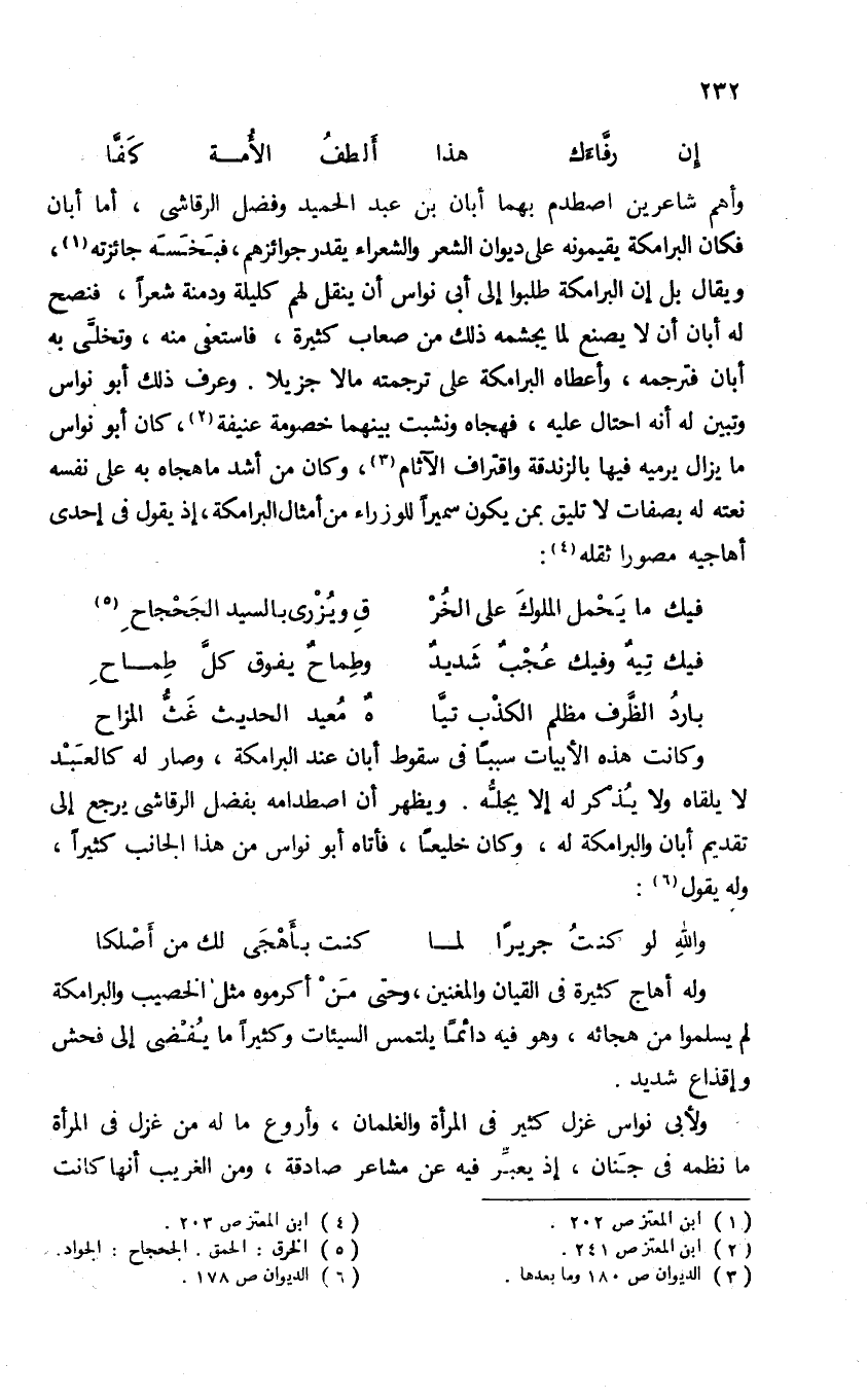 وأهم شاعرين اصطدم بهما أبان بن عبد الحميد وفضل الرقاشى، أما أبان فكان البرامكة يقيمونه على ديوان الشعر والشعراء يقدر جوائزهم، فبخسه جائزته (¬1)، ويقال بل إن البرامكة طلبوا إلى أبى نواس أن ينقل لهم كليلة ودمنة شعرا، فنصح له أبان أن لا يصنع لما يجشمه ذلك من صعاب كثيرة، فاستعفى منه، وتخلّى به أبان فترجمه، وأعطاه البرامكة على ترجمته مالا جزيلا. وعرف ذلك أبو نواس وتبين له أنه احتال عليه، فهجاه ونشبت بينهما خصومة عنيفة (¬2)، كان أبو نواس ما يزال يرميه فيها بالزندقة واقتراف الآثام (¬3)، وكان من أشد ماهجاه به على نفسه نعته له بصفات لا تليق بمن يكون سميرا للوزراء من أمثال البرامكة، إذ يقول فى إحدى أهاجيه مصورا ثقله (¬4):