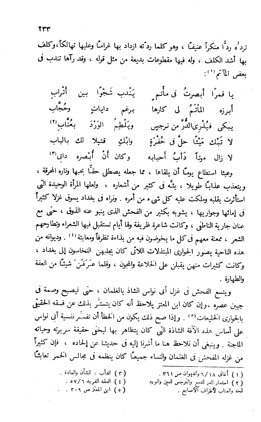 ويتسع الفحش فى غزل أبى نواس الشاذ بالغلمان، حتى ليصبح وصمة فى جبين عصره، وإن كان ابن المعتز يلاحظ أنه كان يتستّر بذلك عن فسقه الحقيقى بالجوارى الخليعات (¬5). وإذا صح ذلك يكون من الخطأ أن تفسّر نفسية أبى نواس على أساس هذه الآفة الشاذة التى كان يتظاهر بها ليخفى حقيقة سريرته وحياته الماجنة. وينبغى أن نلاحظ هنا ما أشرنا إليه فى حديثنا عن إلحاده، فإن كثيرا من غزله المفحش فى الغلمان والنساء جميعا كان ينظمه فى مجالس الخمر تعابثا