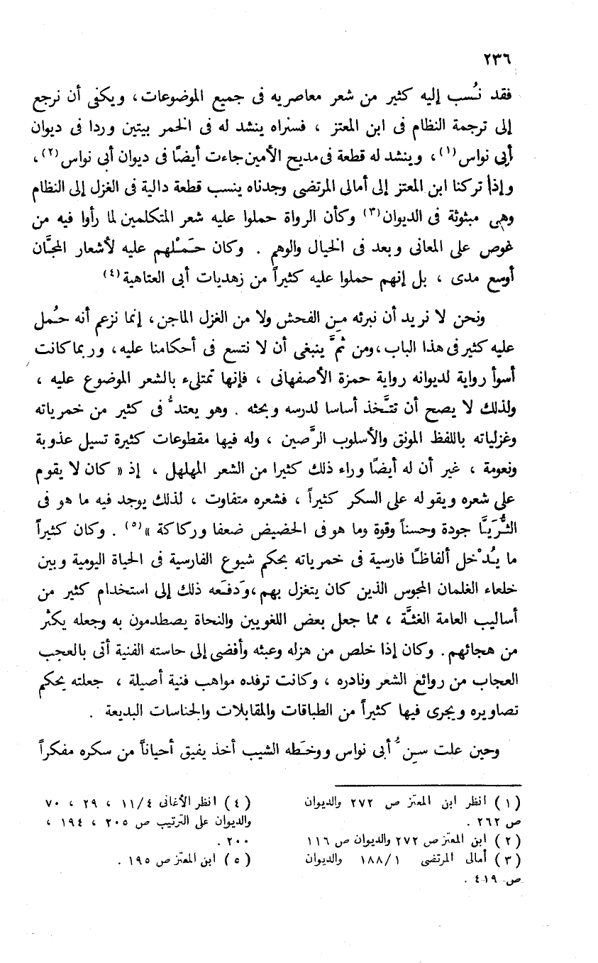 ونحن لا نريد أن نبرئه من الفحش ولا من الغزل الماجن، إنما نزعم أنه حمل عليه كثير فى هذا الباب، ومن ثمّ ينبغى أن لا نتسع فى أحكامنا عليه، وربما كانت أسوأ رواية لديوانه رواية حمزة الأصفهانى، فإنها تمتلئ بالشعر الموضوع عليه، ولذلك لا يصح أن تتّخذ أساسا لدرسه وبحثه. وهو يعتدّ فى كثير من خمرياته وغزلياته باللفظ المونق والأسلوب الرّصين، وله فيها مقطوعات كثيرة تسيل عذوبة ونعومة، غير أن له أيضا وراء ذلك كثيرا من الشعر المهلهل، إذ «كان لا يقوم على شعره ويقوله على السكر كثيرا، فشعره متفاوت، لذلك يوجد فيه ما هو فى الثّريّا جودة وحسنا وقوة وما هو فى الحضيض ضعفا وركاكة» (¬5). وكان كثيرا ما يدخل ألفاظا فارسية فى خمرياته بحكم شيوع الفارسية فى الحياة اليومية وبين خلعاء الغلمان المجوس الذين كان يتغزل بهم، ودفعه ذلك إلى استخدام كثير من أساليب العامة الغثّة، مما جعل بعض اللغويين والنحاة يصطدمون به وجعله يكثر من هجائهم. وكان إذا خلص من هزله وعبثه وأفضى إلى حاسته الفنية أتى بالعجب العجاب من روائع الشعر ونادره، وكانت ترفده مواهب فنية أصيلة، جعلته يحكم تصاويره ويجرى فيها كثيرا من الطباقات والمقابلات والجناسات البديعة.
