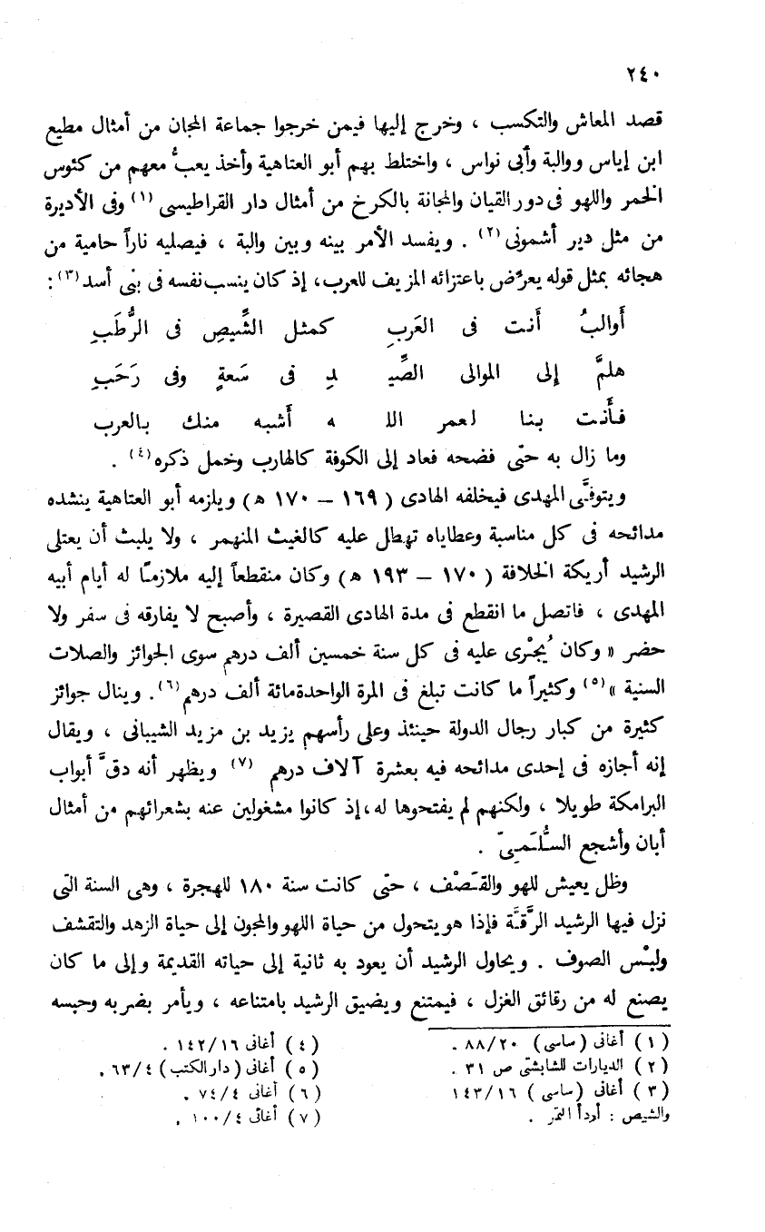 قصد المعاش والتكسب، وخرج إليها فيمن خرجوا جماعة المجان من أمثال مطيع ابن إياس ووالبة وأبى نواس، واختلط بهم أبو العتاهية وأخذ يعبّ معهم من كئوس الخمر واللهو فى دور القيان والمجانة بالكرخ من أمثال دار القراطيسى (¬1) وفى الأديرة من مثل دير أشمونى (¬2). ويفسد الأمر بينه وبين والبة، فيصليه نارا حامية من هجائه بمثل قوله يعرّض باعتزائه المزيف للعرب، إذ كان ينسب نفسه فى بنى أسد (¬3):