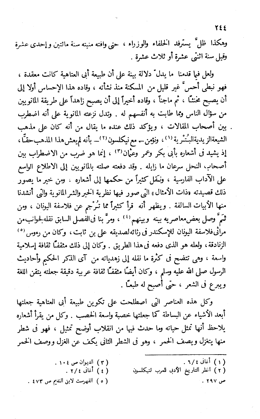 ولعل فيما قدمنا ما يدلّ دلالة بينة على أن طبيعة أبى العتاهية كانت معقدة، فهو نبطى أحسّ غير قليل من المسكنة منذ نشأته، وقاده هذا الإحساس أولا إلى أن يصبح مخنثا، ثم ماجنا، وقاده أخيرا إلى أن يصبح زاهدا على طريقة المانويين من سؤال الناس ومما طابت به أنفسهم له. وتدل نزعته المانوية على أنه اضطرب بين أصحاب المقالات، ويؤكد ذلك عنده ما يقال من أنه كان على مذهب الشيعة الزيدية البترية (¬1)، ونؤمن-مع نيكلسون (¬2) -بأنه لم يعش هذا المذهب حقّا، إذ يشيد فى أشعاره بأبى بكر وعمر وعثمان (¬3)، إنما هو ضرب من الاضطراب بين أصحاب النحل سرعان ما زايله. وقد دفعته صلته بالمانويين إلى الاطلاع الواسع على الآداب الفارسية، ونقل كثيرا من حكمها إلى أشعاره. ومن خير ما يصور ذلك قصيدته «ذات الأمثال» التى صور فيها نظرية الخير والشر المانوية والتى أنشدنا منها الأبيات السالفة. ويظهر أنه قرأ كثيرا مما ترجم عن فلاسفة اليونان، ومن ثمّ وصل بعض معاصريه بينه وبينهم (¬4)، ومرّ بنا فى الفصل السابق نقله لجوانب من مراثى فلاسفة اليونان للإسكندر فى رثائه لصديقه على بن ثابت، وكان من رءوس (¬5) الزنادقة، ولعله هو الذى دفعه فى هذا الطريق. وكان إلى ذلك مثقفا ثقافة إسلامية واسعة، وهى تتضح فى كثرة ما نقله إلى رهدياته من آى الذكر الحكيم وأحاديث الرسول صلى الله عليه وسلم، وكان أيضا مثقفا ثقافة عربية دقيقة جعلته يتقن اللغة ويبرع فى الشعر، حتى أصبح له طبعا.