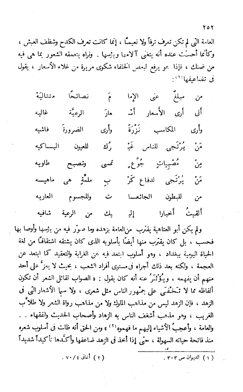 العامة التى لم تكن تعرف ترفا ولا نعيما، إنما كانت تعرف الكدح وشظف العبش، وكأنما أحست عنده أنه يتغنى آلامها وبؤسها. ونراه يتعمقه الشعور بما هى فيه من ضنك، فإذا هو يرفع لبعض الخلفاء شكوى مريرة من غلاء الأسعار، يقول فى تضاعيفها (¬1):