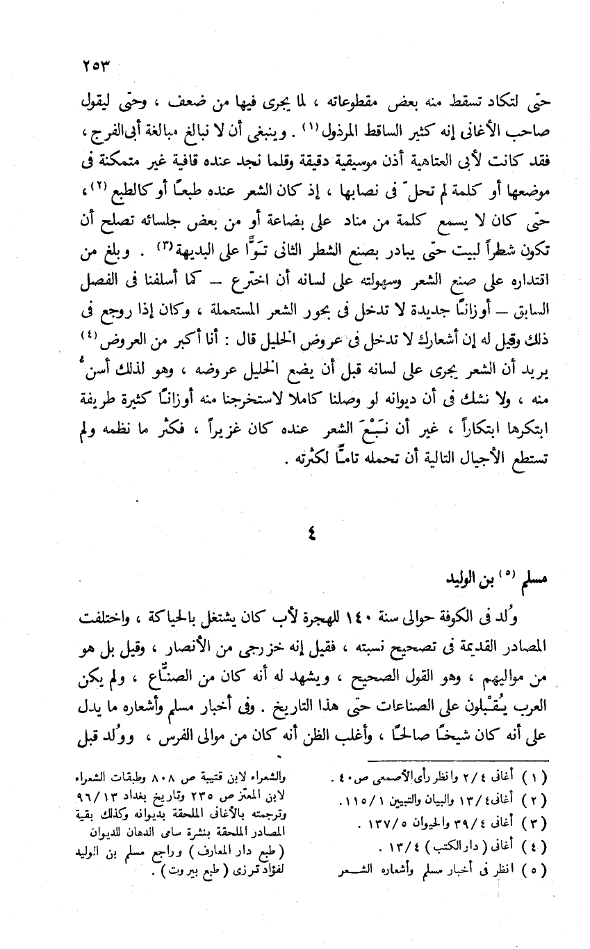 (¬5) انظر فى أخبار مسلم وأشعاره الشعر والشعراء لابن قتيبة ص 808 وطبقات الشعراء لابن المعتز ص 235 وتاريخ بغداد 13/ 96 وترجمته بالأغانى الملحقة بديوانه وكذلك بقية المصادر الملحقة بنشرة سامى الدهان للديوان (طبع دار المعارف) وراجع مسلم بن الوليد لفؤاد ترزى (طبع بيروت).