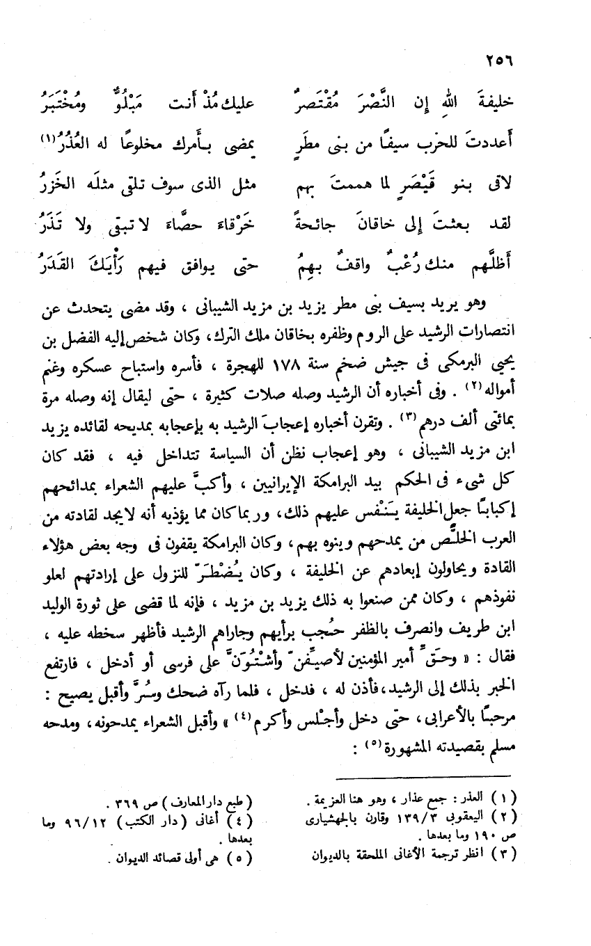 وهو يريد بسيف بنى مطر يزيد بن مزيد الشيبانى، وقد مضى يتحدث عن انتصارات الرشيد على الروم وظفره بخاقان ملك الترك، وكان شخص إليه الفضل بن يحيى البرمكى فى جيش ضخم سنة 178 للهجرة، فأسره واستباح عسكره وغنم أمواله (¬2). وفى أخباره أن الرشيد وصله صلات كثيرة، حتى ليقال إنه وصله مرة بمائتى ألف درهم (¬3). وتقرن أخباره إعجاب الرشيد به بإعجابه بمديحه لقائده يزيد ابن مزيد الشيبانى، وهو إعجاب نظن أن السياسة تتداخل فيه، فقد كان كل شئ فى الحكم بيد البرامكة الإيرانيين، وأكبّ عليهم الشعراء بمدائحهم إكبابا جعل الخليفة ينفس عليهم ذلك، وربما كان مما يؤذيه أنه لا يجد لقادته من العرب الخلّص من يمدحهم وينوه بهم، وكان البرامكة يقفون فى وجه بعض هؤلاء القادة ويحاولون إبعادهم عن الخليفة، وكان يضطر للنزول على إرادتهم لعلو نفوذهم، وكان ممن صنعوا به ذلك يزيد بن مزيد، فإنه لما قضى على ثورة الوليد ابن طريف وانصرف بالظفر حجب برأيهم وجاراهم الرشيد فأظهر سخطه عليه، فقال: «وحقّ أمير المؤمنين لأصيّفنّ وأشتونّ على فرسى أو أدخل، فارتفع الخبر بذلك إلى الرشيد، فأذن له، فدخل، فلما رآه ضحك وسرّ وأقبل يصيح: