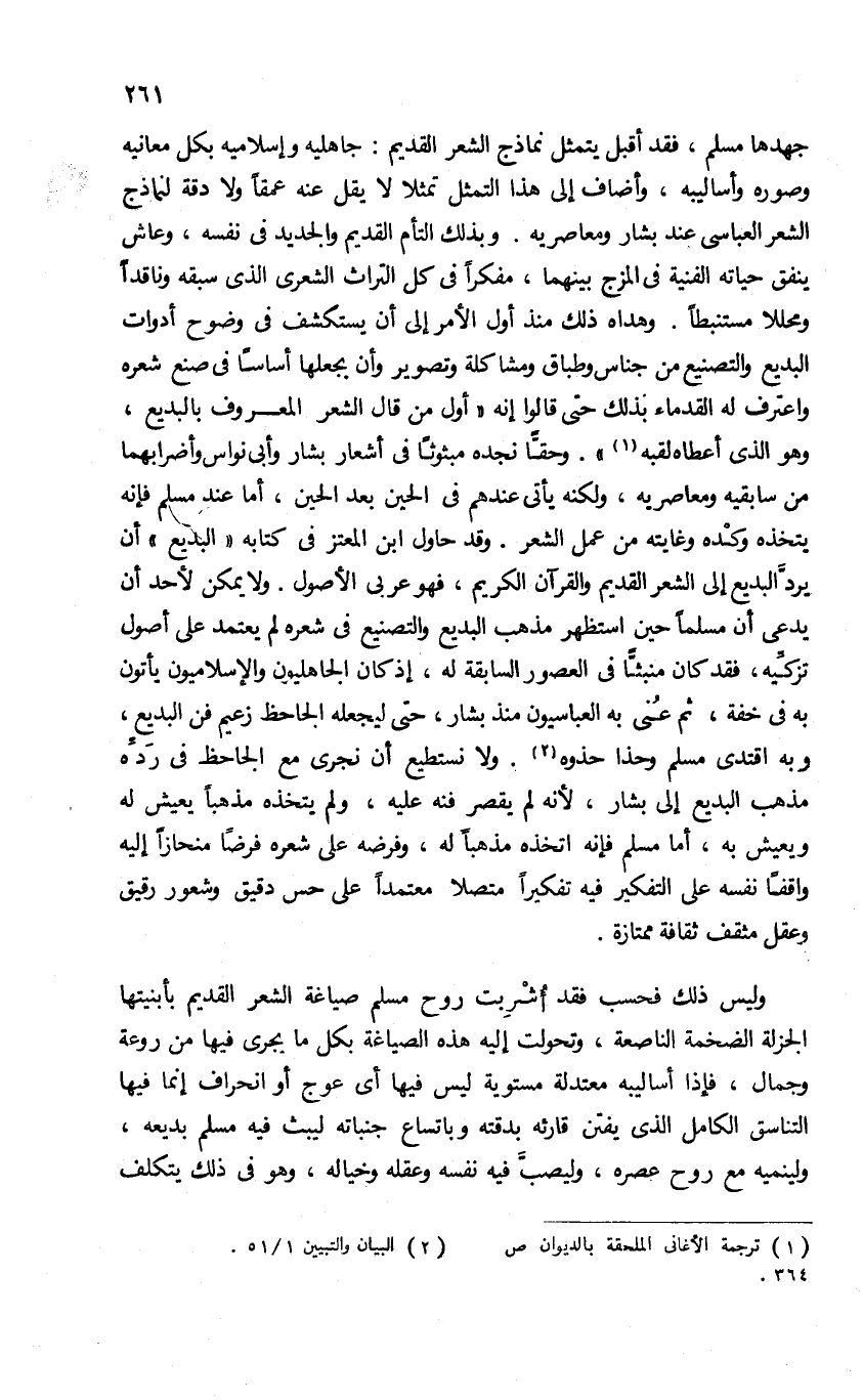جهدها مسلم، فقد أقبل يتمثل نماذج الشعر القديم: جاهليه وإسلاميه بكل معانيه وصوره وأساليبه، وأضاف إلى هذا التمثل تمثلا لا يقل عنه عمقا ولا دقة لنماذج الشعر العباسى عند بشار ومعاصريه. وبذلك التأم القديم والجديد فى نفسه، وعاش ينفق حياته الفنية فى المزج بينهما، مفكرا فى كل التراث الشعرى الذى سبقه وناقدا ومحللا مستنبطا. وهداه ذلك منذ أول الأمر إلى أن يستكشف فى وضوح أدوات البديع والتصنيع من جناس وطباق ومشاكلة وتصوير وأن يجعلها أساسا فى صنع شعره واعترف له القدماء بذلك حتى قالوا إنه «أول من قال الشعر المعروف بالبديع، وهو الذى أعطاه لقبه (¬1)». وحقّا نجده مبثوثا فى أشعار بشار وأبى نواس وأضرابهما من سابقيه ومعاصريه، ولكنه يأتى عندهم فى الحين بعد الحين، أما عند مسلم فإنه يتخذه وكده وغايته من عمل الشعر. وقد حاول ابن المعتز فى كتابه «البديع» أن يردّ البديع إلى الشعر القديم والقرآن الكريم، فهو عربى الأصول. ولا يمكن لأحد أن يدعى أن مسلما حين استظهر مذهب البديع والتصنيع فى شعره لم يعتمد على أصول تزكّيه، فقد كان منبثّا فى العصور السابقة له، إذ كان الجاهليون والإسلاميون يأتون به فى خفة، ثم عنى به العباسيون منذ بشار، حتى ليجعله الجاحظ زعيم فن البديع، وبه اقتدى مسلم وحذا حذوه (¬2). ولا نستطيع أن نجرى مع الجاحظ فى ردّه مذهب البديع إلى بشار، لأنه لم يقصر فنه عليه، ولم يتخذه مذهبا يعيش له ويعيش به، أما مسلم فإنه اتخذه مذهبا له، وفرضه على شعره فرضا منحازا إليه واقفا نفسه على التفكير فيه تفكيرا متصلا معتمدا على حس دقيق وشعور رقيق وعقل مثقف ثقافة ممتازة.