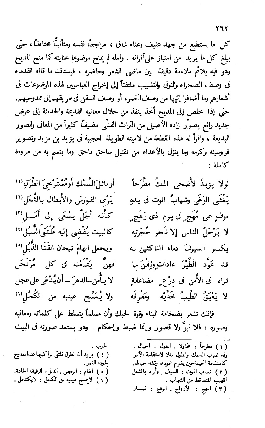 كل ما يستطيع من جهد عنيف وعناء شاق، مراجعا نفسه ومتأنيّا محتاطا، حتى يبلغ كل ما يريد من امتياز على أقرانه. ولعله لم يمنح موضوعا عنايته كما منح المديح وهو فيه يلاثم ملاءمة دقيقة بين ماضى الشعر وحاضره، فيستنفد ما قاله القدماء فى وصف الصحراء والنوق والتشبيب ملتفتا إلى إخراج العباسيين لهذه الموضوعات فى أشعارهم وما أضافوا إليها من وصف الخمر، أو وصف السفن فى طريقهم إلى ممدوحيهم.
