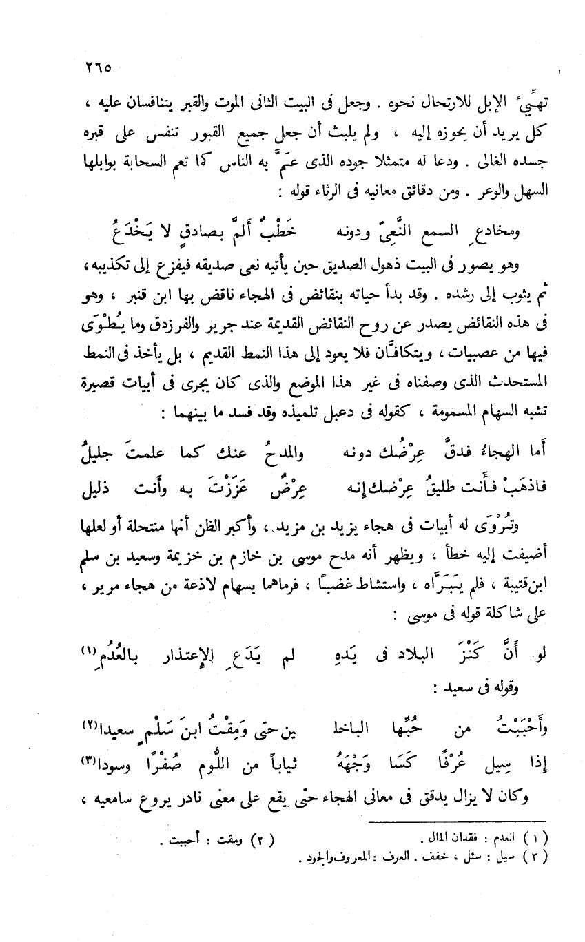 وهو يصور فى البيت ذهول الصديق حين يأتيه نعى صديقه فيفزع إلى تكذيبه، ثم يثوب إلى رشده. وقد بدأ حياته بنقائض فى الهجاء ناقض بها ابن قنبر، وهو فى هذه النقائض يصدر عن روح النقائض القديمة عند جرير والفرزدق وما يطوى فيها من عصبيات، ويتكافّان فلا يعود إلى هذا النمط القديم، بل يأخذ فى النمط المستحدث الذى وصفناه فى غير هذا الموضع والذى كان يجرى فى أبيات قصيرة تشبه السهام المسمومة، كقوله فى دعبل تلميذه وقد فسد ما بينهما: