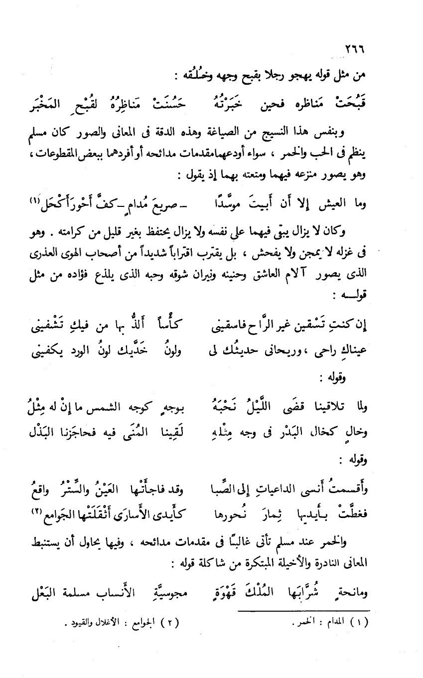 وبنفس هذا النسيج من الصياغة وهذه الدقة فى المعانى والصور كان مسلم ينظم فى الحب والخمر، سواء أودعهما مقدمات مدائحه أو أفردهما ببعض المقطوعات، وهو يصور منزعه فيهما ومتعته بهما إذ يقول: