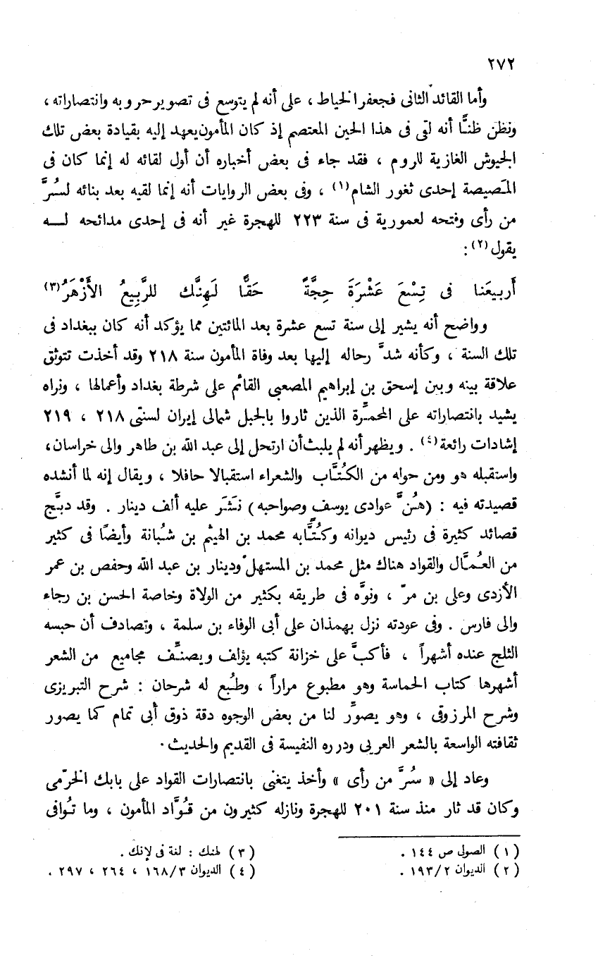 وواضح أنه يشير إلى سنة تسع عشرة بعد المائتين مما يؤكد أنه كان ببغداد فى تلك السنة، وكأنه شدّ رحاله إليها بعد وفاة المأمون سنة 218 وقد أخذت تتوثق علاقة بينه وبين إسحق بن إبراهيم المصعبى القائم على شرطة بغداد وأعمالها، ونراه يشيد بانتصاراته على المحمّرة الذين ثاروا بالجبل شمالى إيران لسنتى 218، 219 إشادات رائعة (¬4). ويظهر أنه لم يلبث أن ارتحل إلى عبد الله بن طاهر والى خراسان، واستقبله هو ومن حوله من الكتّاب والشعراء استقبالا حافلا، ويقال إنه لما أنشده قصيدته فيه: (هنّ عوادى يوسف وصواحبه) نشر عليه ألف دينار. وقد دبّج قصائد كثيرة فى رئيس ديوانه وكتّابه محمد بن الهيثم بن شبانة وأيضا فى كثير من العمّال والقواد هناك مثل محمد بن المستهل ودينار بن عبد الله وحفص بن عمر الأزدى وعلى بن مرّ، ونوّه فى طريقه بكثير من الولاة وخاصة الحسن بن رجاء والى فارس. وفى عودته نزل بهمذان على أبى الوفاء بن سلمة، وتصادف أن حبسه الثلج عنده أشهرا، فأكبّ على خزانة كتبه يؤلف ويصنّف مجاميع من الشعر أشهرها كتاب الحماسة وهو مطبوع مرارا، وطبع له شرحان: شرح التبريزى وشرح المرزوقى، وهو يصوّر لنا من بعض الوجوه دقة ذوق أبى تمام كما يصور ثقافته الواسعة بالشعر العربى ودرره النفيسة فى القديم والحديث.